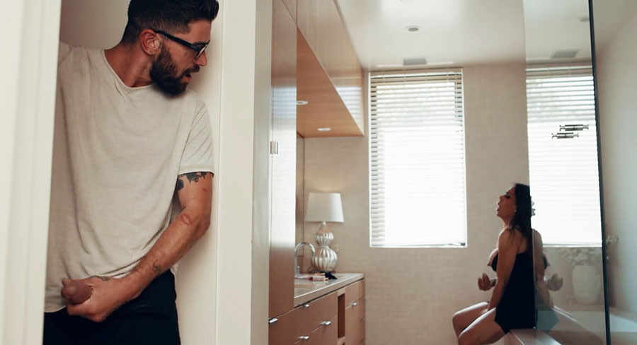 Horny latina shemale is in the bathroom stroking her hard shecock.After that,her stepson watches her and he then jacks off his cock too.Instead of getting mad,she throats his big cock first and lets him fuck her wet ass so hard.