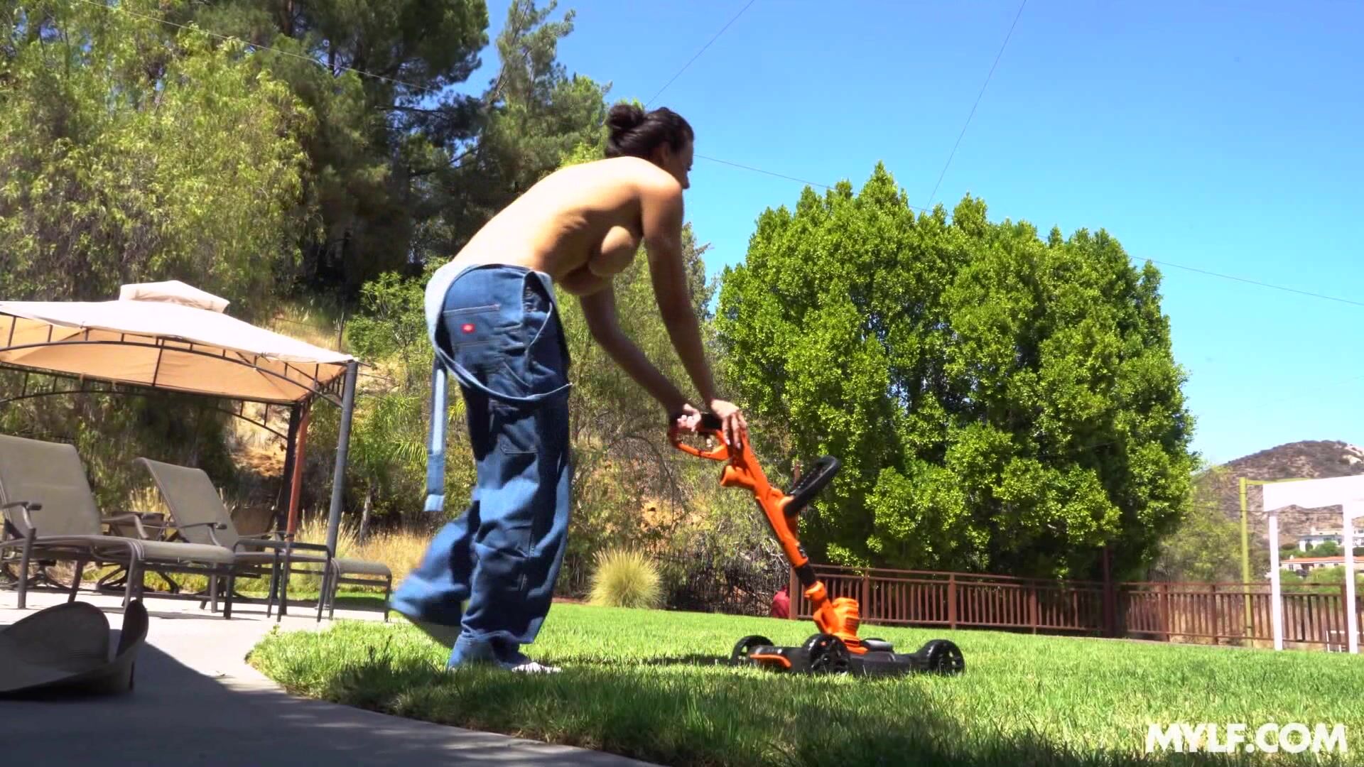 Busty MILF neighbor is stuggling with her yard work