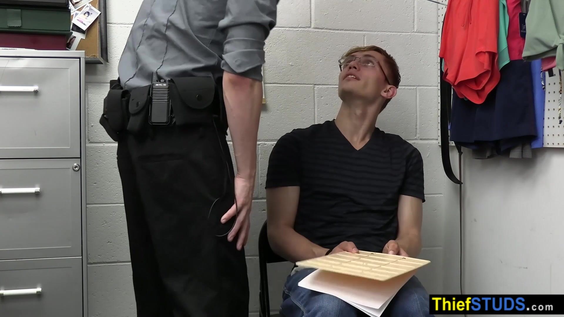 LP officer Cole Church brings suspected thief Darron Bluu to the backroom for some questioning He orders the handcuffed teen in glasses to suck his big dick then the cop anal fucking him bareback to teach him the rules
