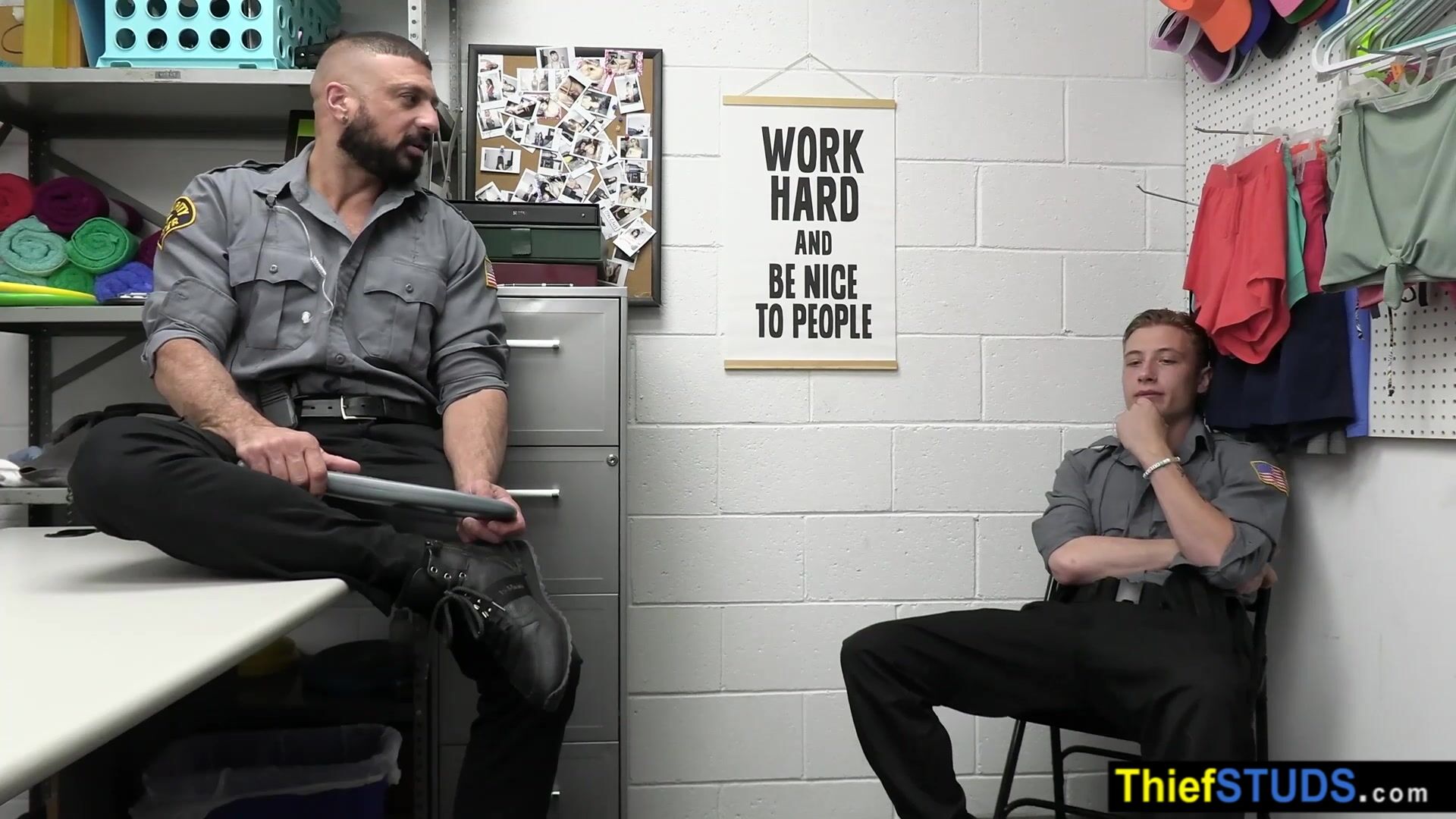 LP officers Cole Church and Marco Napoli are trying to get through their shift but there hasnt been any perps to catch so the muscle gay gets on his knees and sucking his partnes big dick then the twink cop fucking him bareback in doggystyle