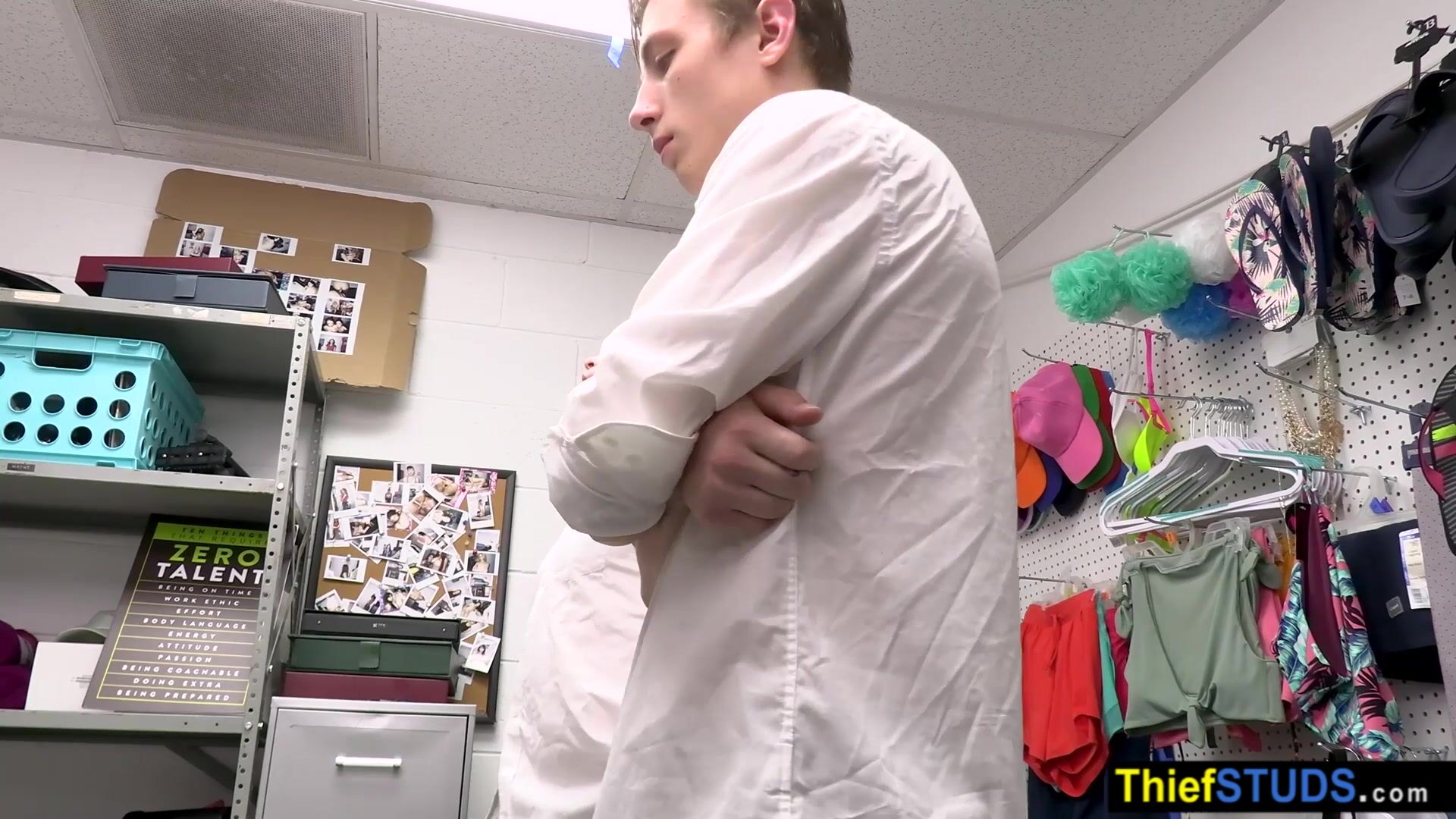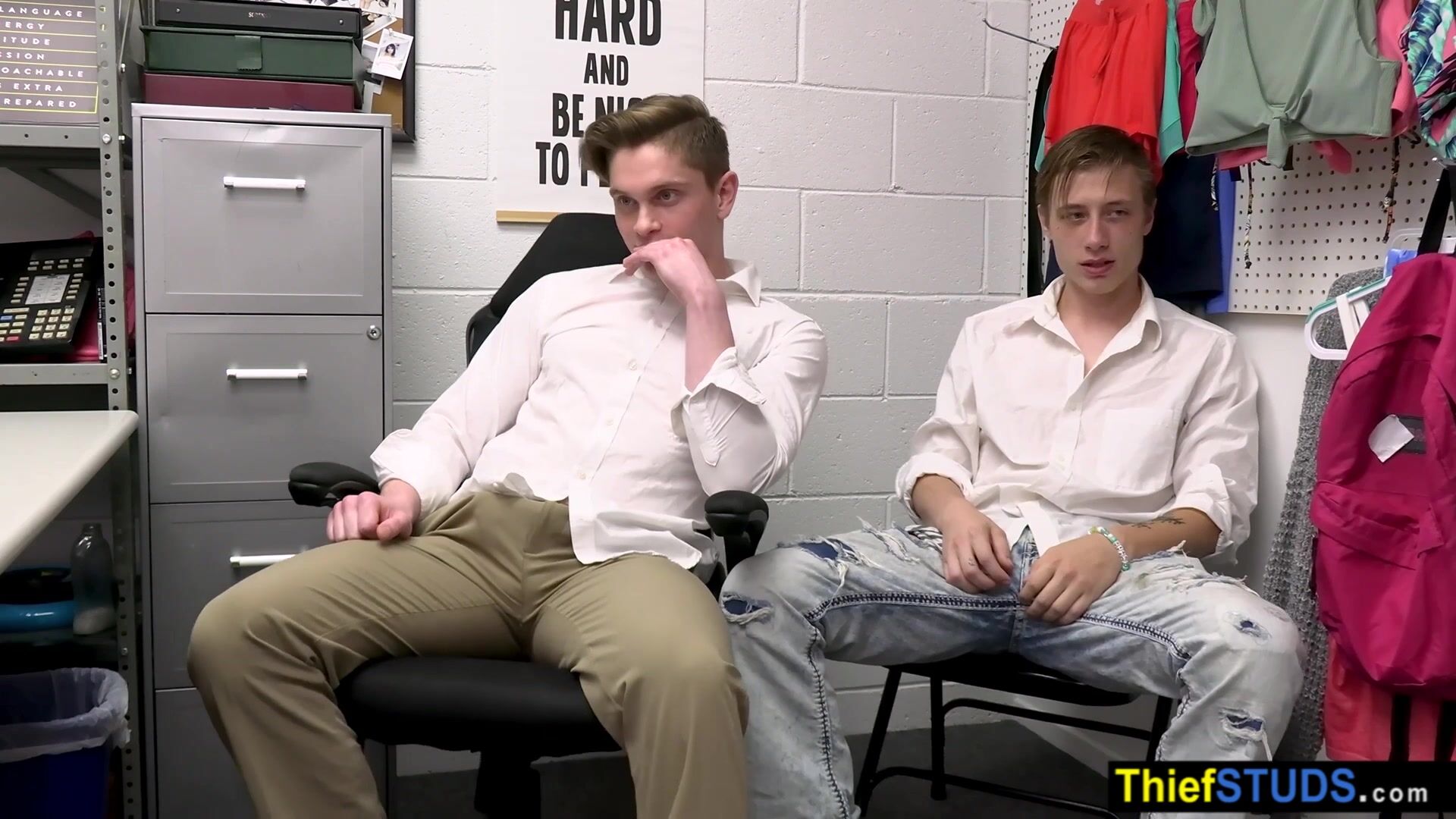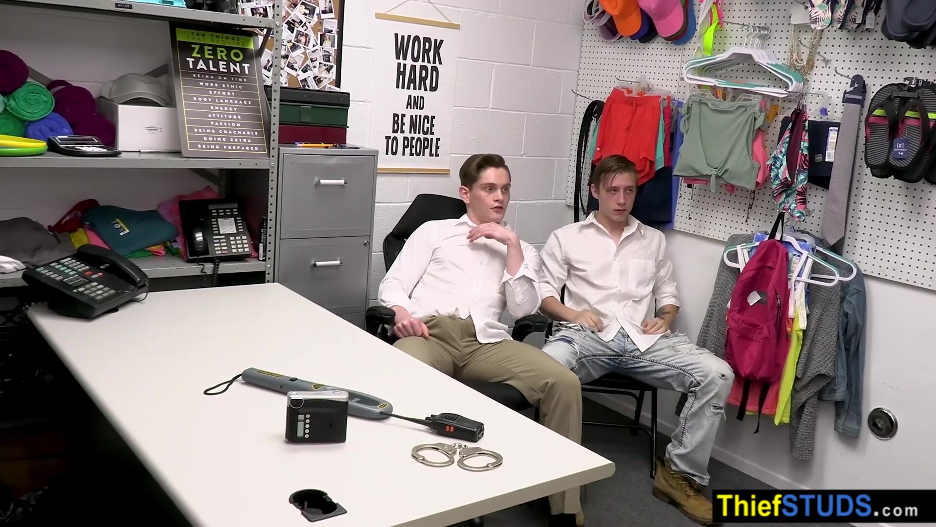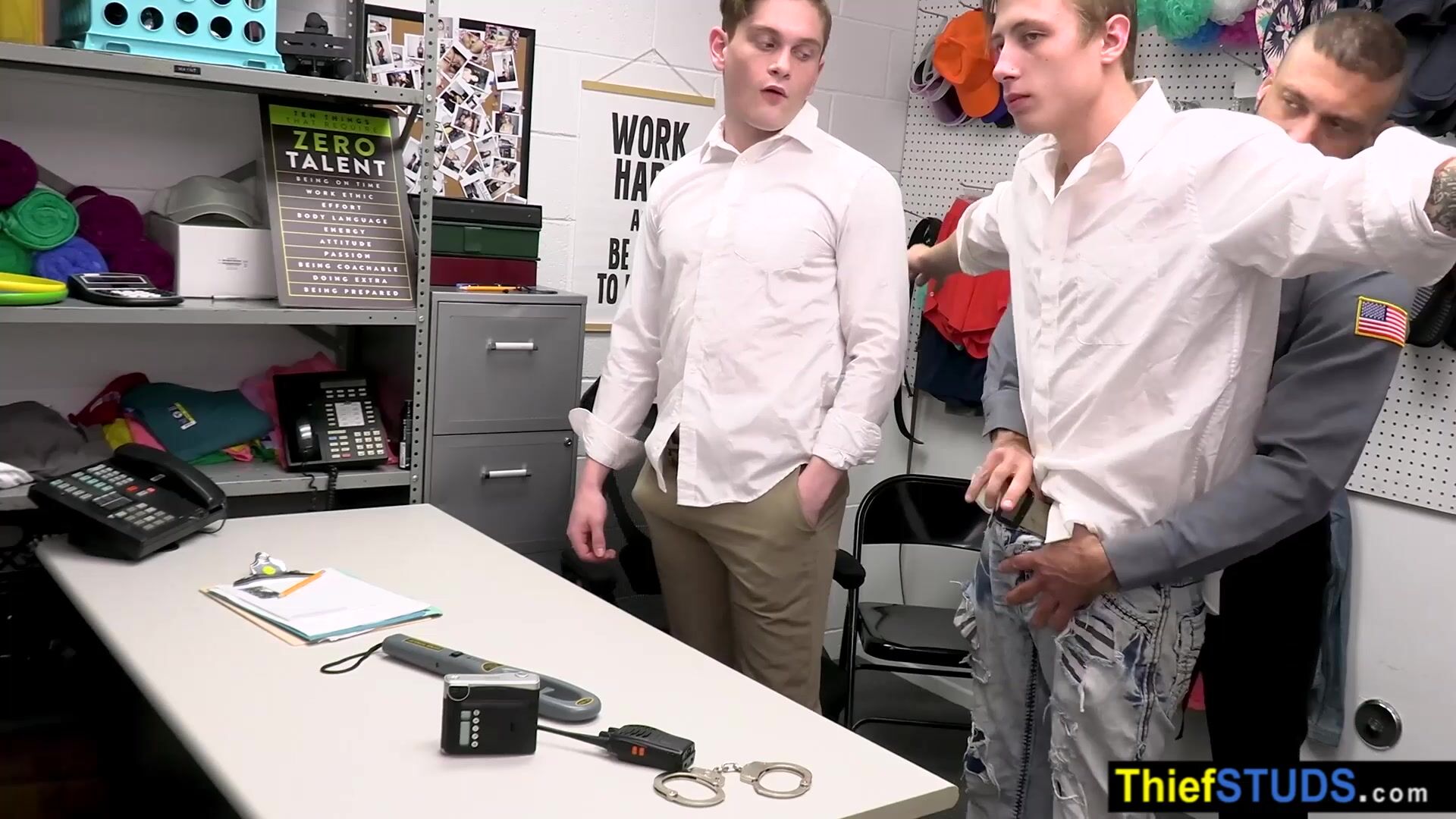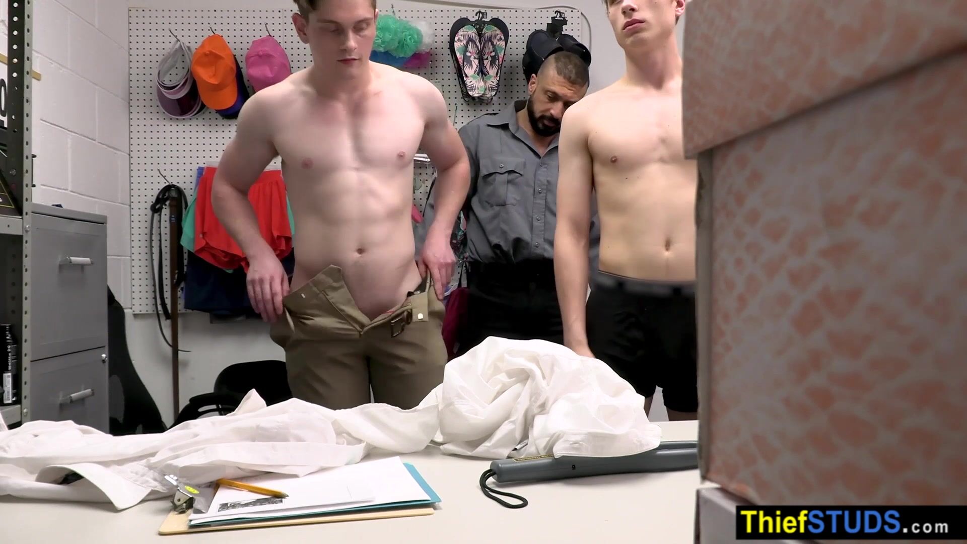 Muscle gay LP officer finds some of the stolen items during full cavity search so he makes a proposition He will let them go if the teens fucking him bareback in the ass but first he is tasting their big dicks