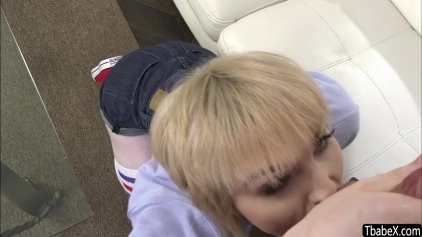 Gorgeous blonde trans woman Ella Hollywood opens the door for hunk masculine stud Micheal Delray and sits with him in the couch. He soon whips out his cock which the tbabe eagerly sucks while kneeling down then gets analed in the couch.