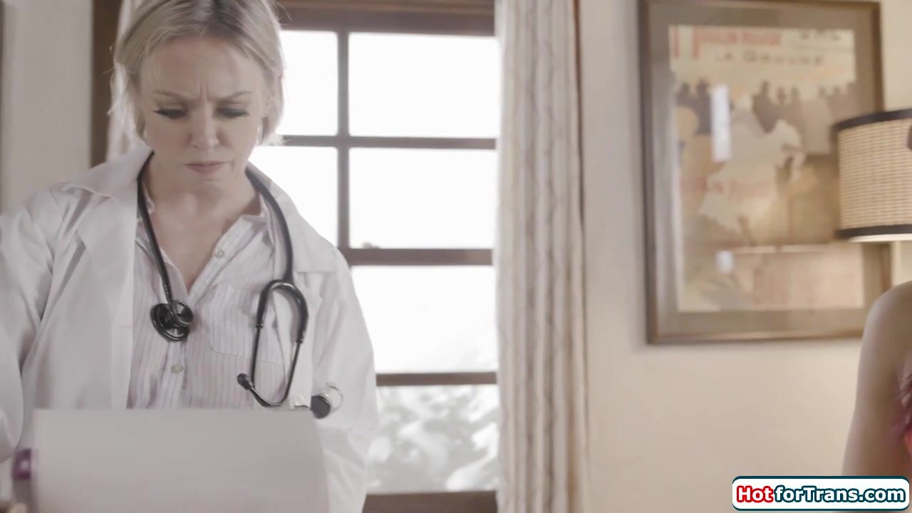 Shemale Khloe Kay undresses for her exam.The busty doctor inspects her tranny cock by giving the ts babe a handjob.The small tits tgirl licks pussy and is sucked off in a sixtynine position.All hard the trans enjoys the big boobs milf riding her dick