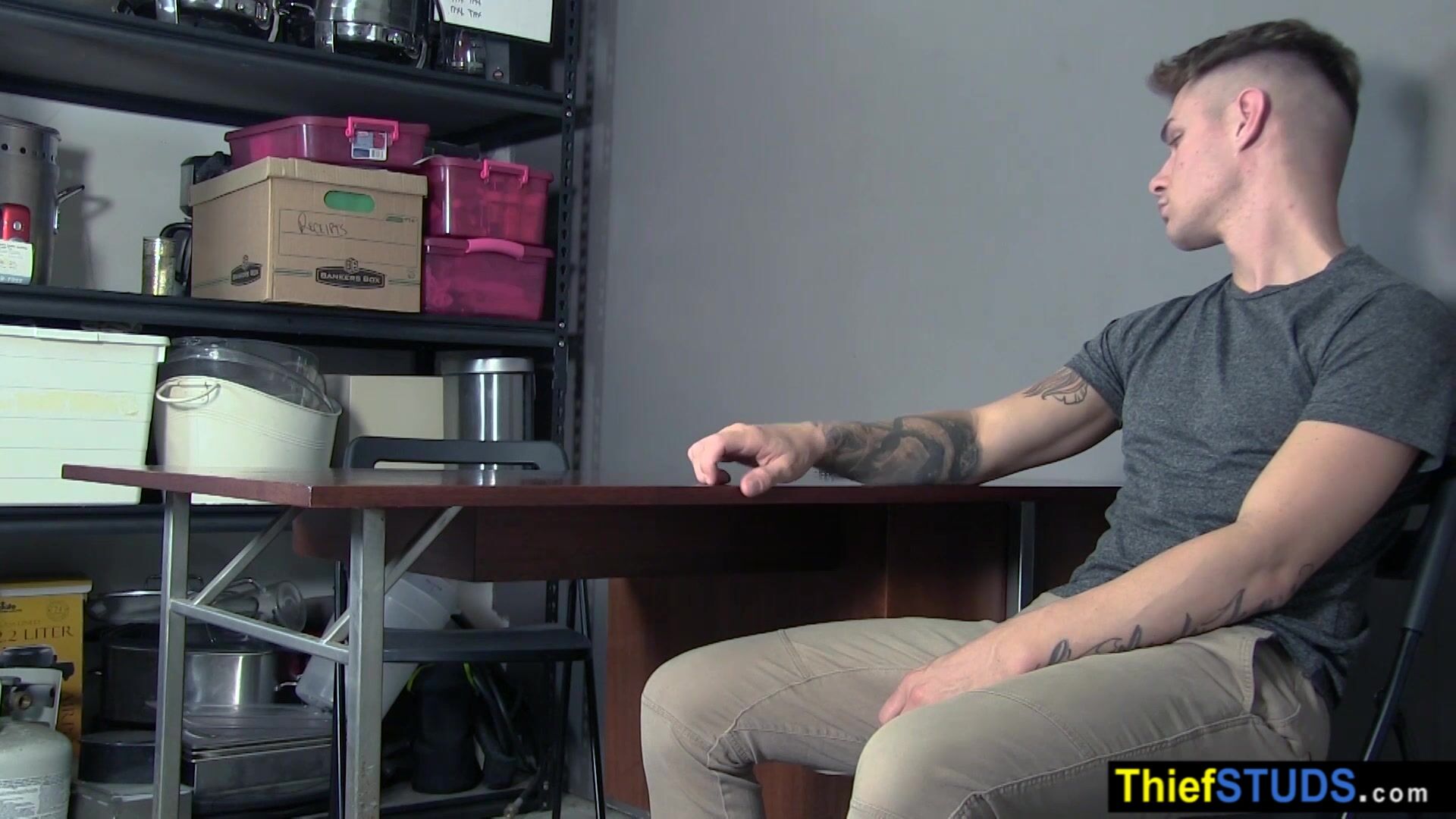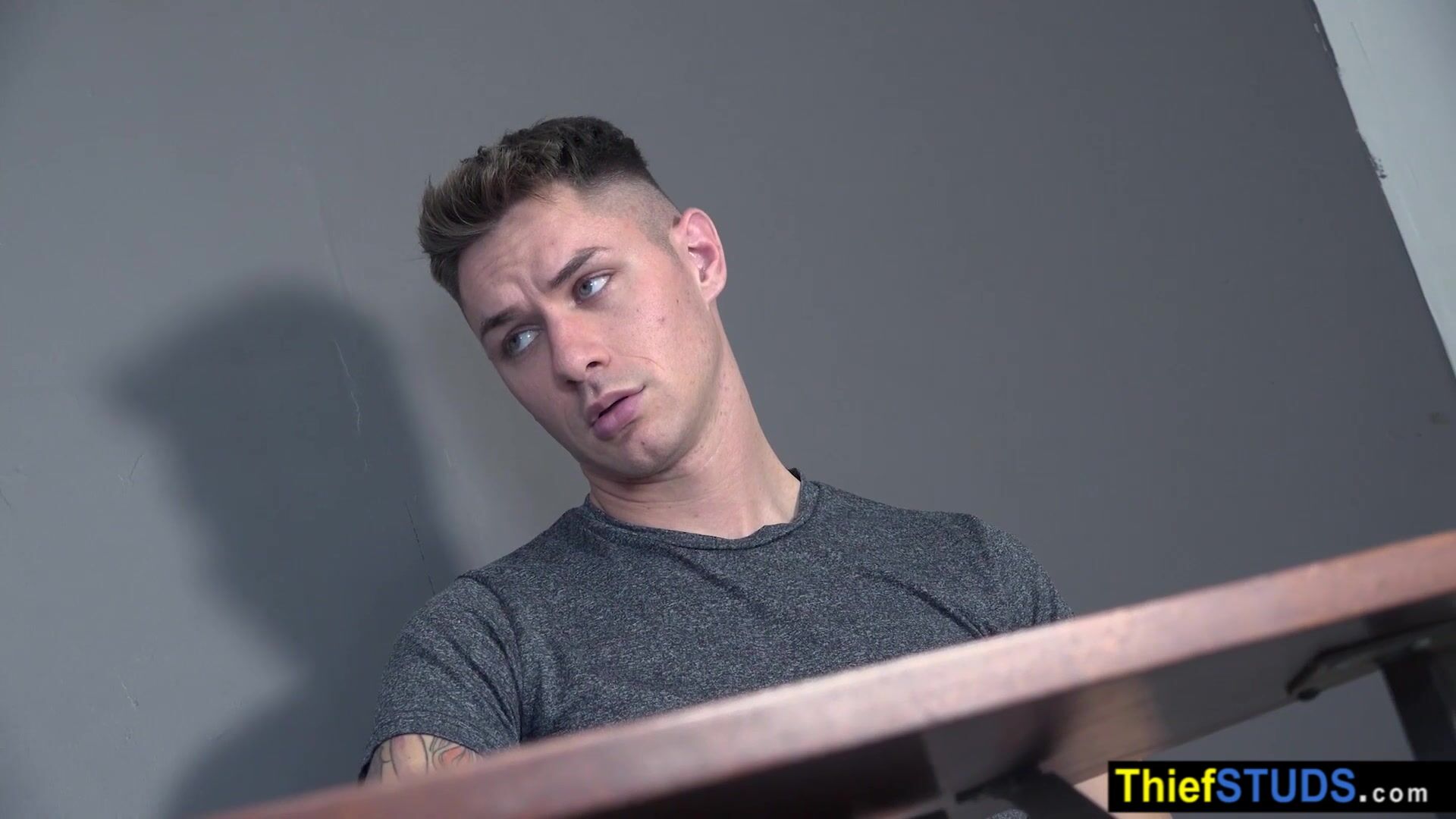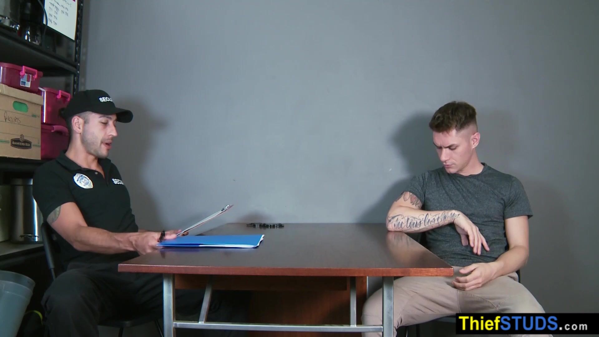 Security officer Jace brings employee Zac Bishop to the backroom for some questioning He is strip searching the inked teen then ordering him to suck his big cock then he is barebacking him axchange his freedom