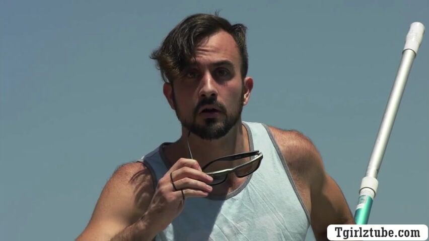 Horny skinny shemale gets her ass barebacked by pool cleaner