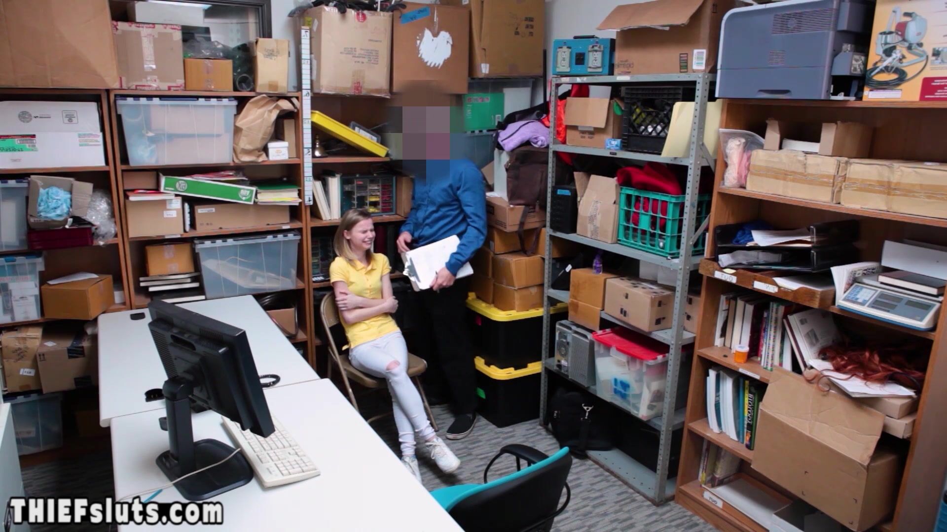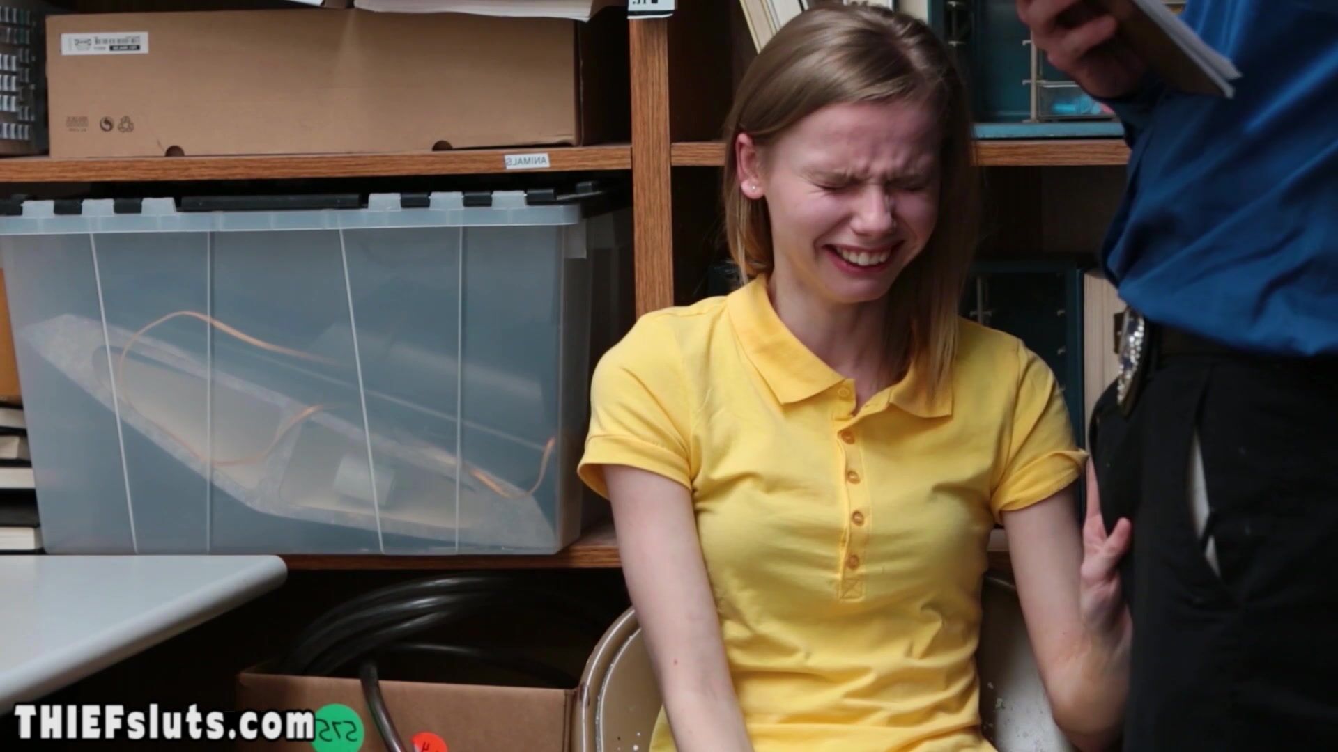 Dirty LP officer strip searching a skinny blonde russian teen shoplifter Catarina Petrov with small tits then he ordering the crying bitch to suck his big dick then he is fucking her pussy hard