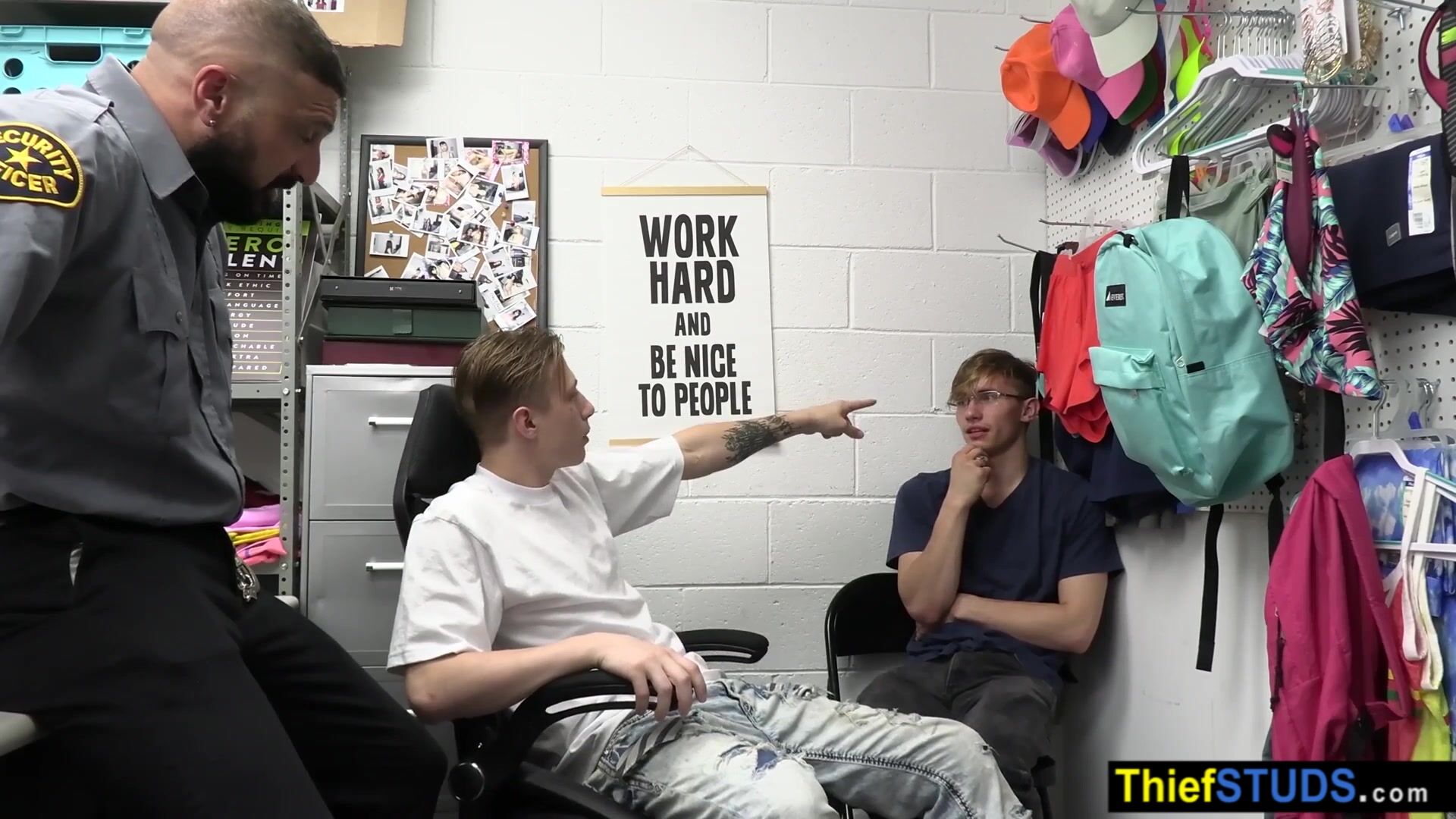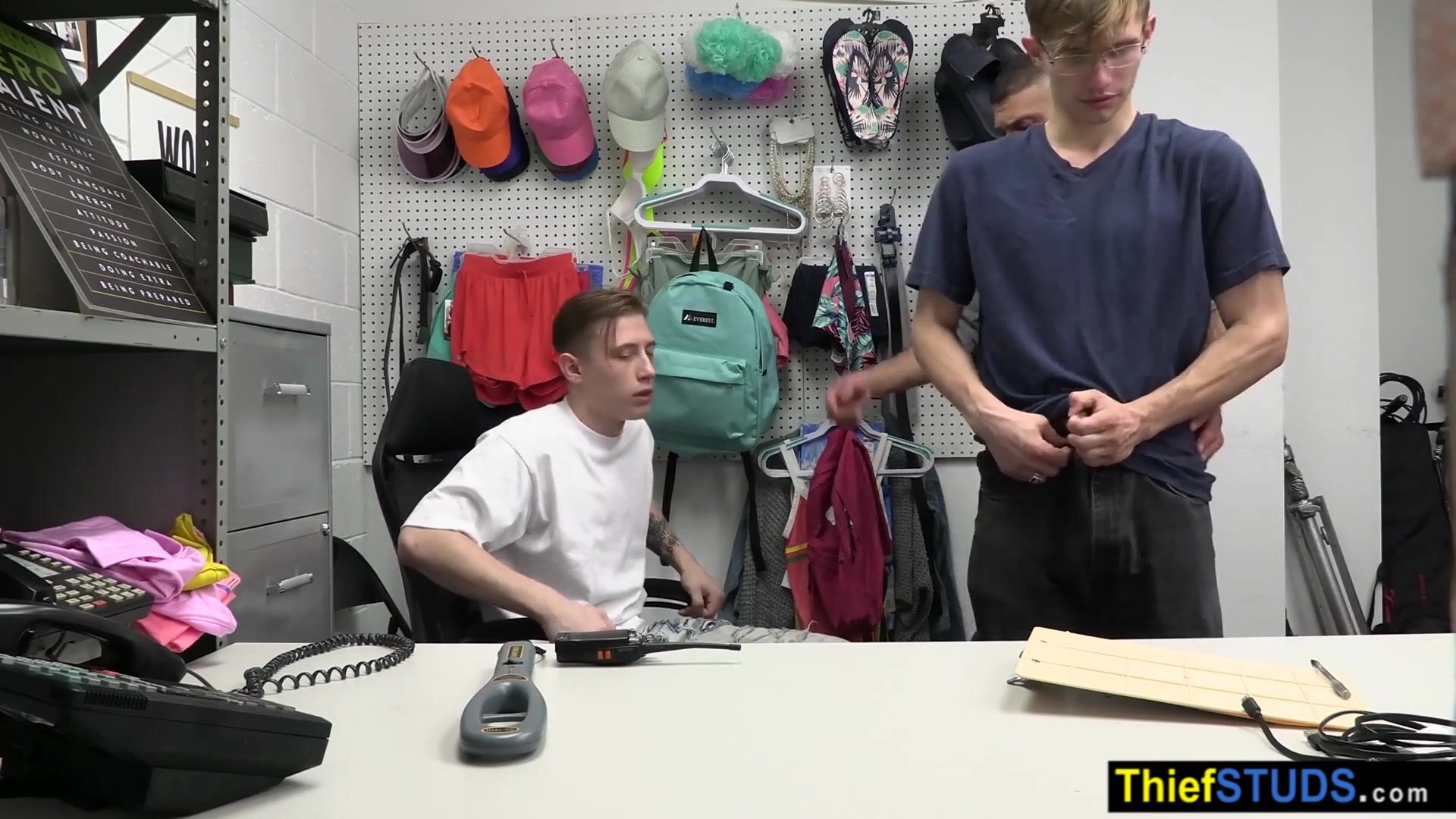 Security officer Marco Napoli brings two suspected perps Adam Awbride and Cole Church into the backroom after strip seach he ordering them to satisfy his big cock bareback after a blowjob he is fucking them during the teens sucking each others dicks