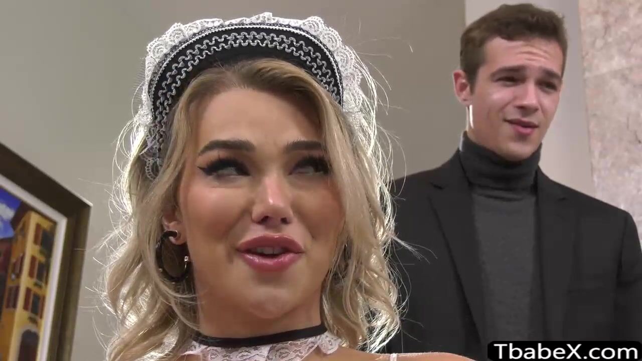 Blonde tbabe Emma Rose cleans the house in seductive maid uniform emphasizing her big boobs and ass. The flashy ts flirts with her hunk boss by masturbating then gives his bigcock a blowjob before her ass gets barebacked doggystyle.