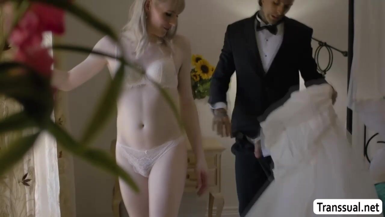 Blonde shemale bride and her soon to be husband get horny and start kissing each other in their room.After that,smalltits TS sucks the hard big cock of her soon to be husband passionately.In return,the dude fucks the wet ass of trans bride.