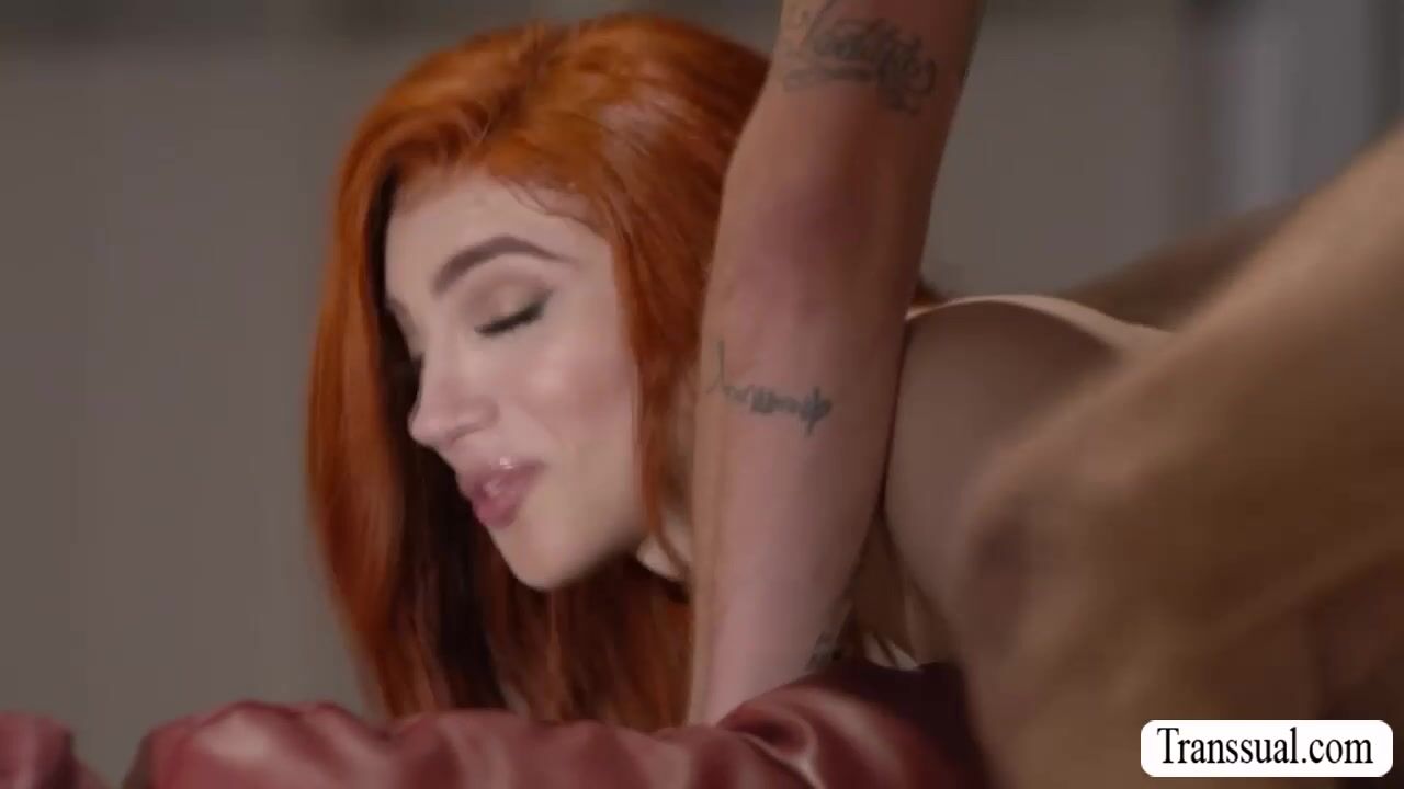 Shemale redhead and her boyfried are so horny and they kiss each other on the couch.After that,the smalltits Tbabe throats the hard dick of her boyfried passionately.In return,the dude fucks the big ass of big ass Tgirl so deep and hard.