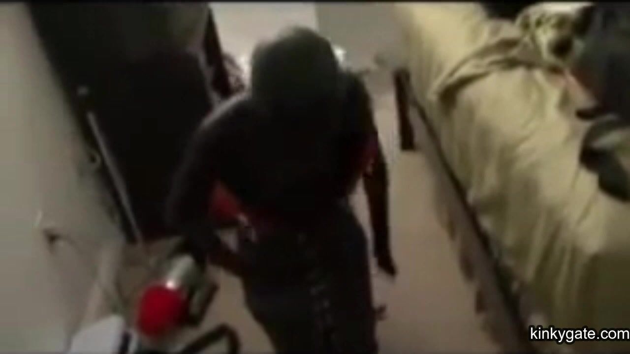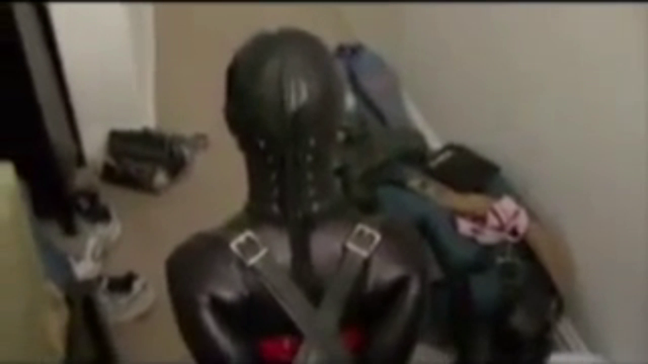 My latex slut has to make every effort to free herself, while I watch her wrestling.