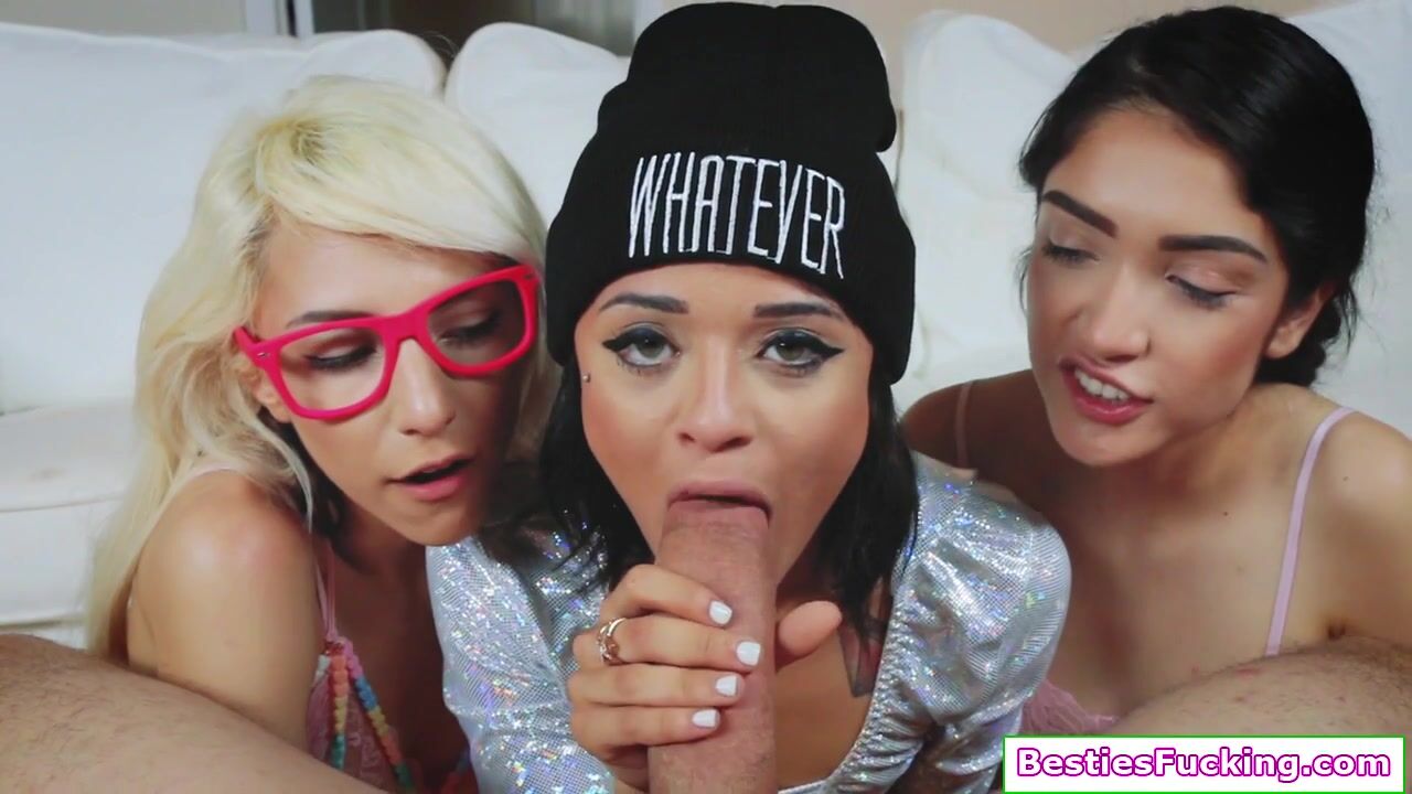A teen latina invites her best friends to join her camming to earn cash.Their viewers want them to get fucked by a big cock so they call on their hunk friend.The bffs blowjob them then takes turns riding on his dick while the others masturbate.