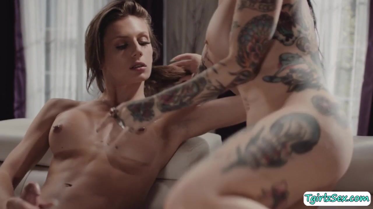 Big tits milf Joanna Angel and her big boobs tranny stepdaughter Jade Venus are kissing in the couch then tits sucking. The busty shemale whips out her big tranny cock and gets a deepthroat blowjob from her blonde stepmom before she fucks her milf pussy.