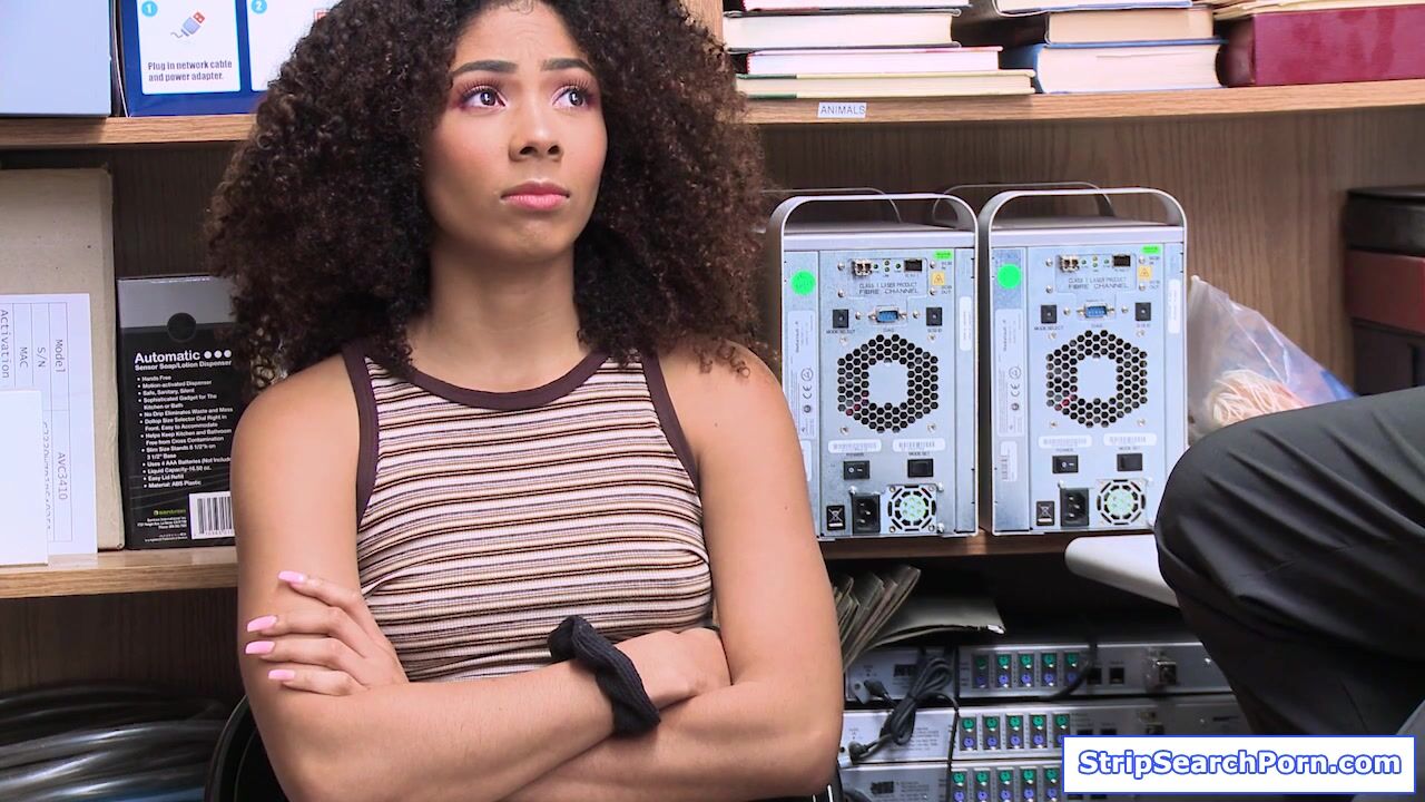 An ebony teen steals from her stepdads store but she gets caught by the security guard.The officer conducts strip search then makes her cooperate to avoid calling the cops.The small tits babe blowjobs him then lets him fuck her tight shaved pussy.