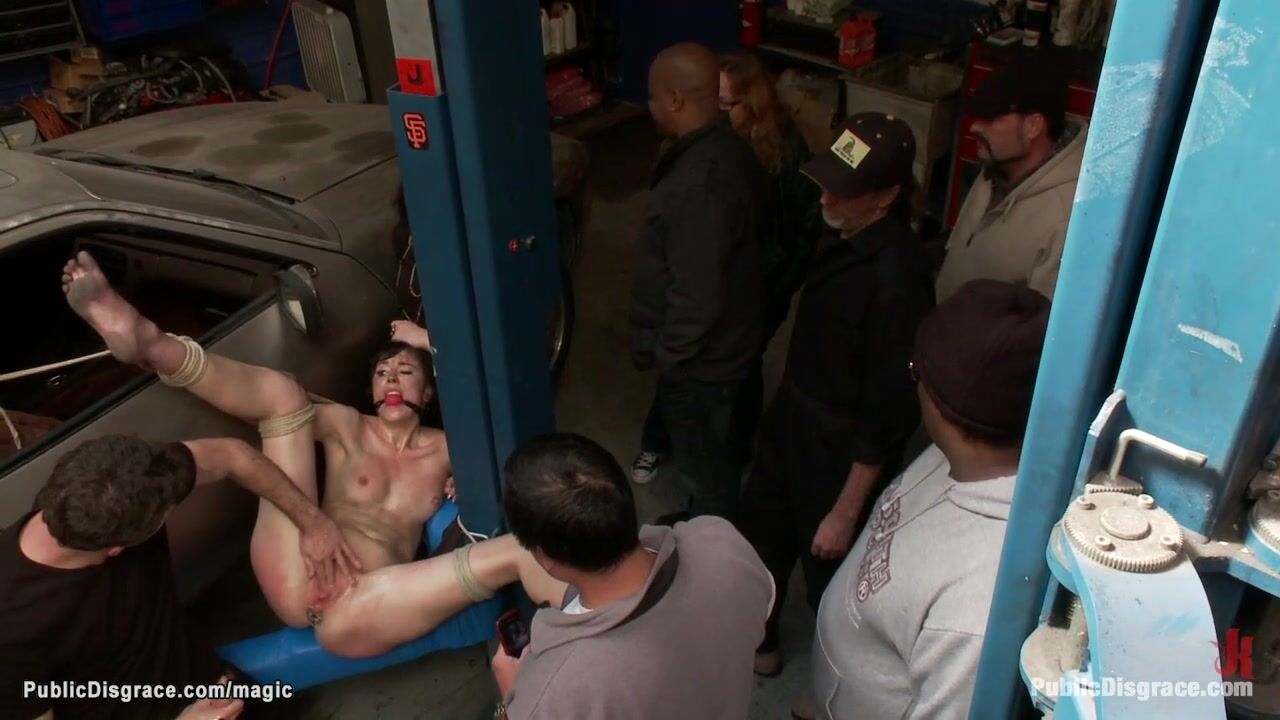 Dirty Emo Coral Aorta is vibed and humiliated in public car repair shop in front of strangers then butt plugged and fucked by big dick James Deen