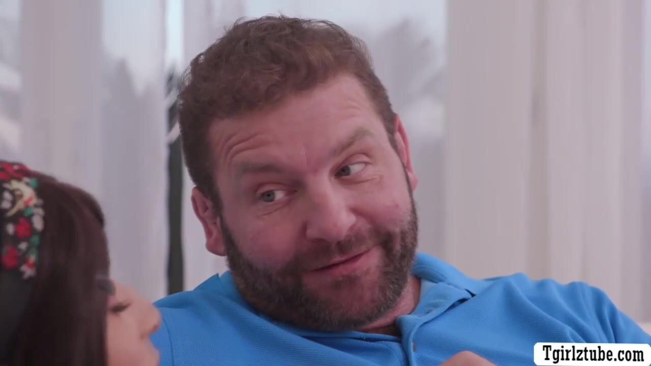 Busty brunette shemale and her stepdad are on the couch watching tv.After that,TS babe gets horny and starts throating her stepdads big cock passionately.In return,her stepdad licks her ass first and he then barebacks it so deep and hard.