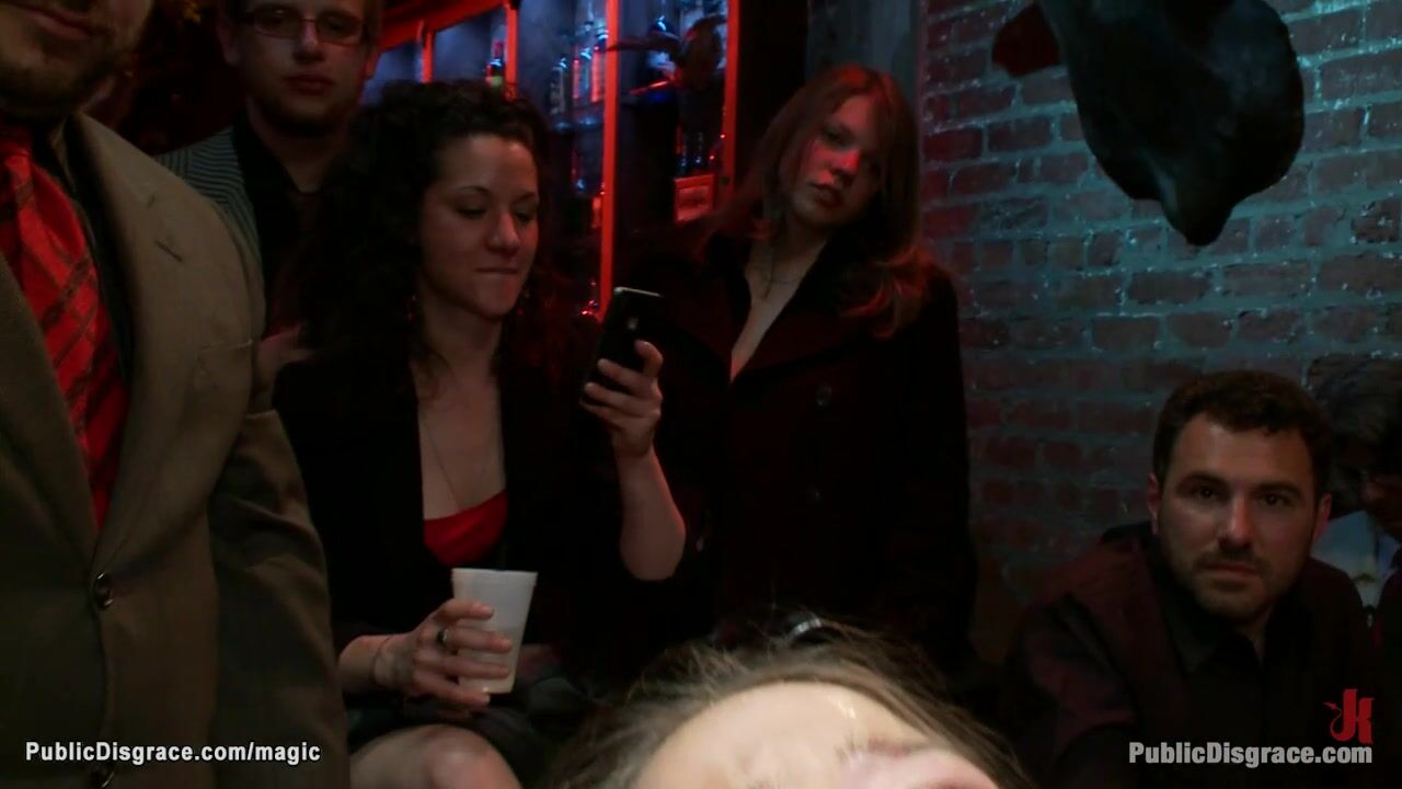 Bound spread on the floor brunette slave slave Vai gets shaved pussy fisted and made squirt then fucked with strap on cocks in public