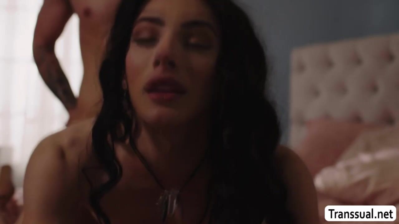 Trans stepmom caught her stepson watching her while shes changing clothes.Her stepson gets out and they start kissing each other on the bed.Next is,she throats his hard big cock passionately and lets him bareback fuck her ass.