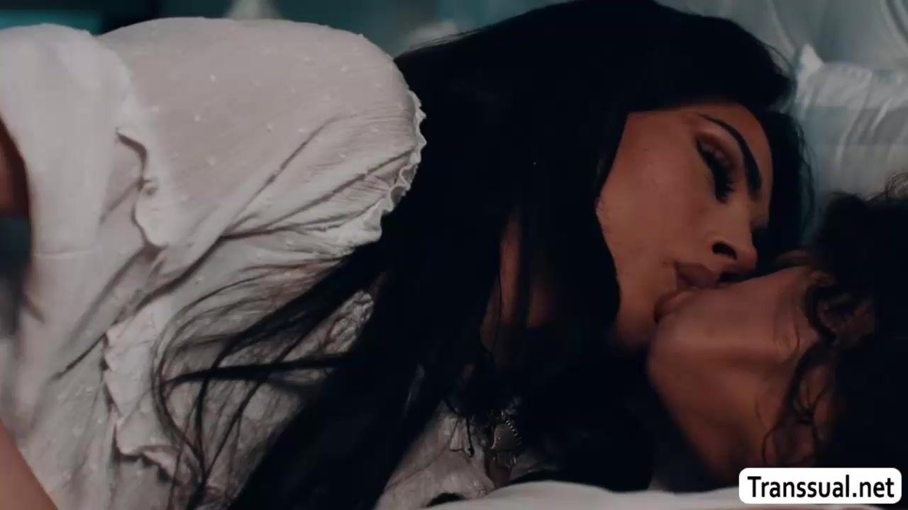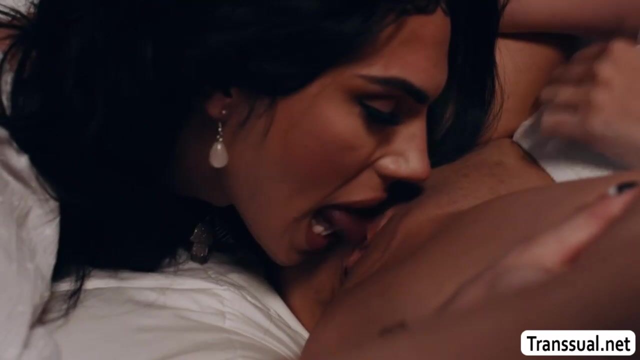 Skinny trans stepmom and her stepdaughter are on the bed cuddling and kissing each other passionately.After that,she goes down and licks her stepdaughters tight pussy.In return,her stepdaughter throats her tranny cock and rides it after.