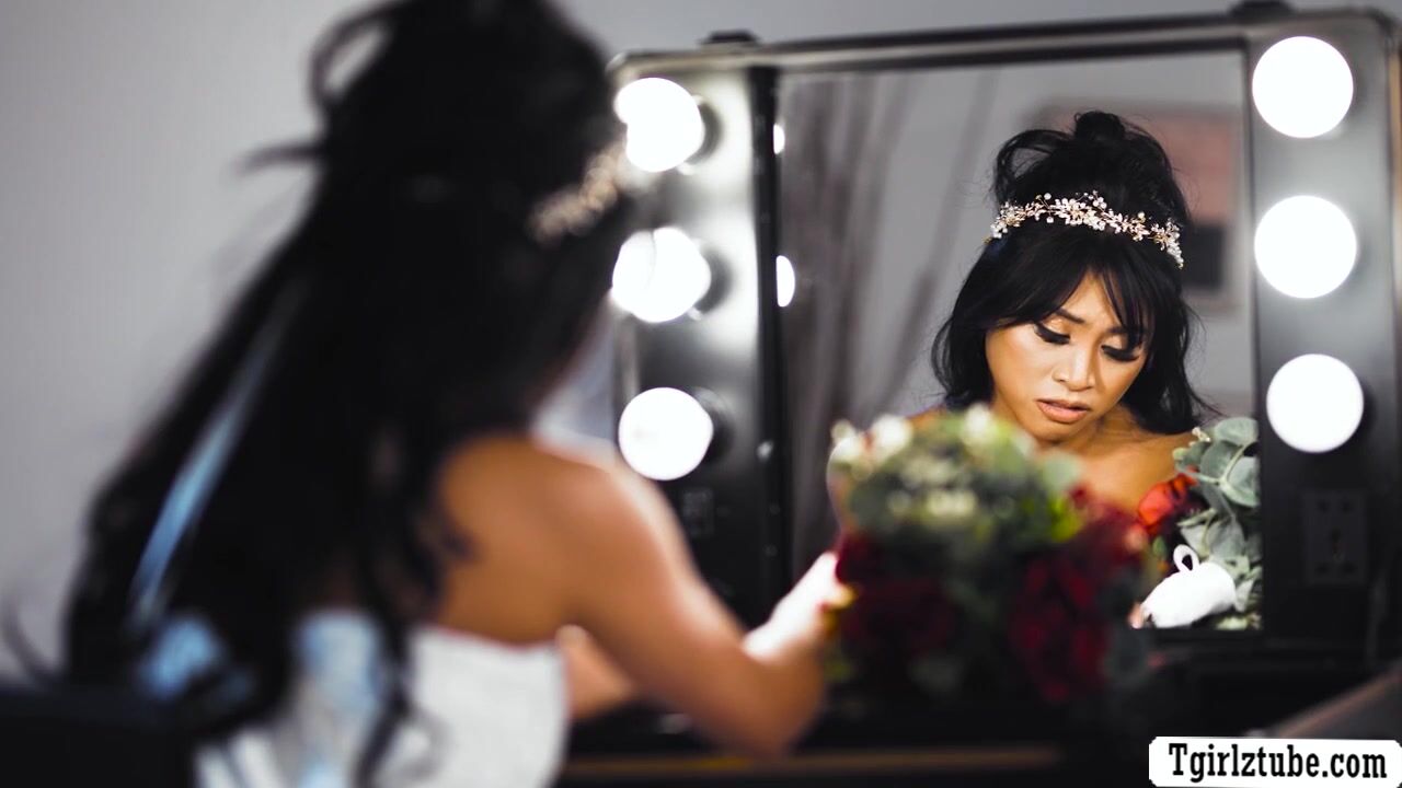 Asian bride is crying because her groom did not show up in their wedding.After that,her Tgirl bestfriend comforts her by kissing her passionately.Next is,she lets her sad bestfriend suck her tranny cock and in return,she licks and fucks her pussy.