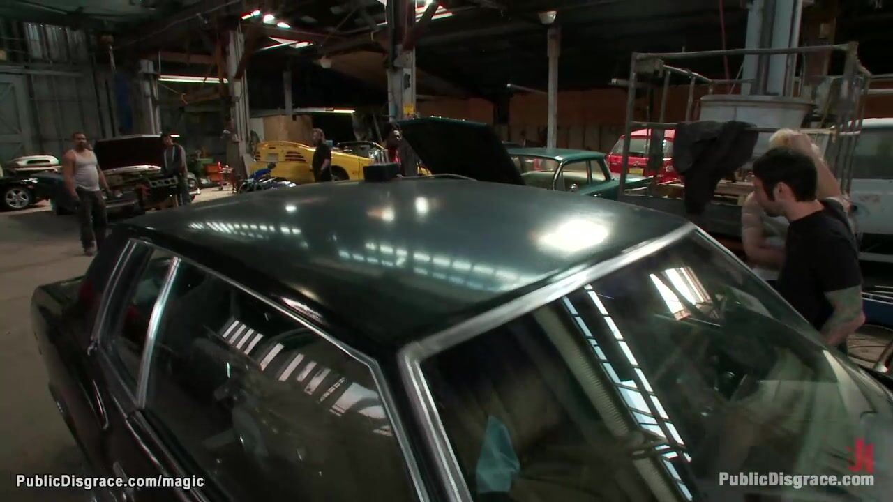Master Tommy Pistol drags bound hot ass blonde slave Dylan Ryan in public auto repair shop and there spanks and anal fucks her with huge dick