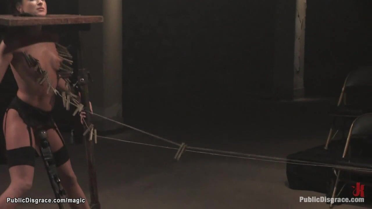 Locked in neck stock and zippered brunette French slave Cecilia Vega is mounted on vibrator then suspended in inverted position mouth fucked in public by John Strong