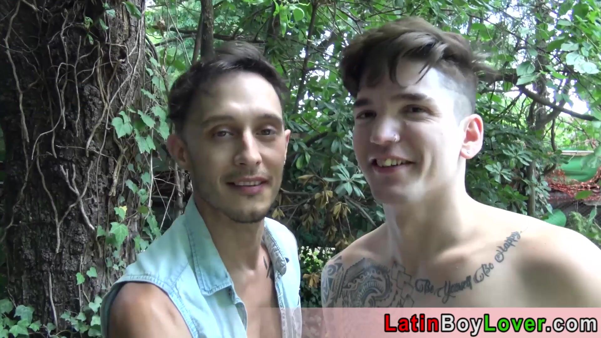 Cute amateur latin teens Kevsho and Nico Ruiz kissing each other in ther forest when a stranger Gabo comes who offering his services for the big cocked twinks and after a blowjob they anal fucking him bareback outdoor
