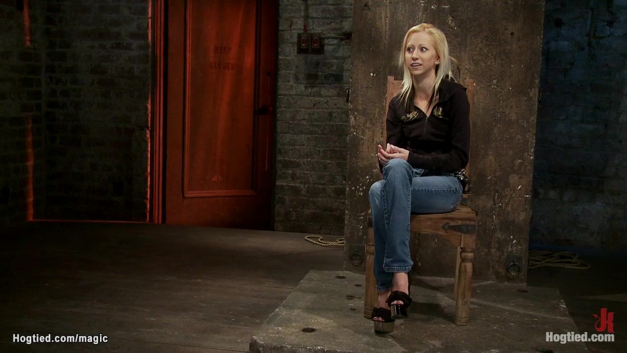 Petite small tits blonde slave Rene Phoenix is bound and suspended in upside down position with crotch roped gets shaved pussy whipped by master Matt Williams on hogtied