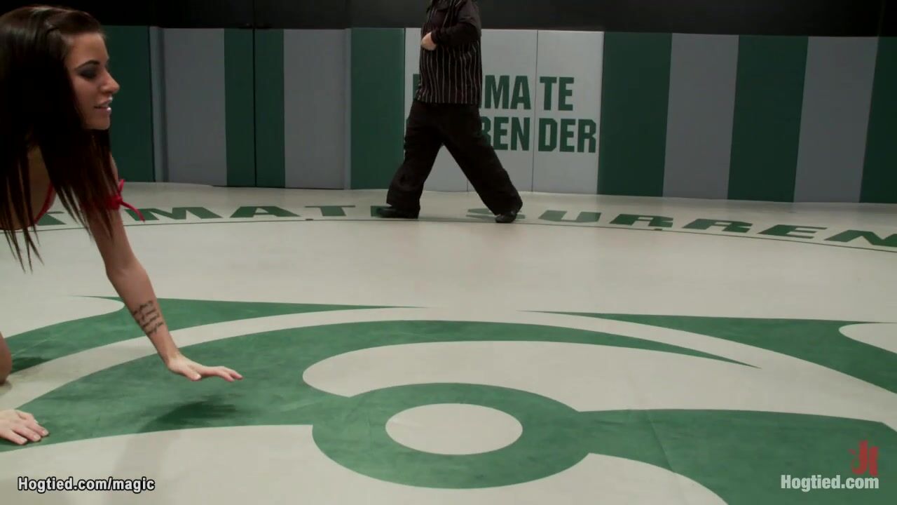 Big boobs lesbian wrestler Ariel X is zipped in back arch position over acrylic hemisphere and rough whipped then fucked with strap on cock on opponent Gia DiMarco