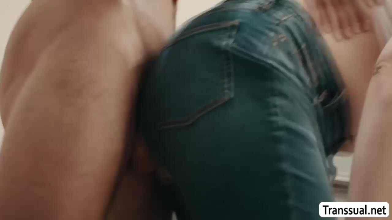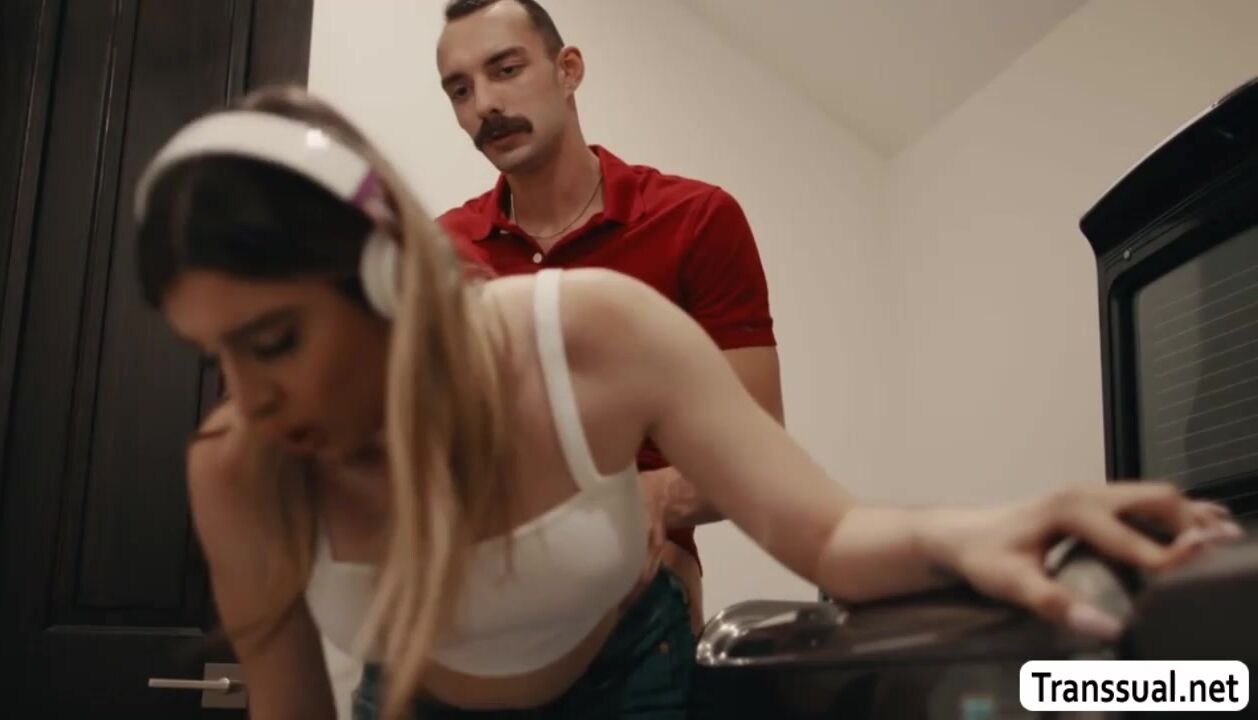 Pervert stepdad watchis his shemale stepdaughter while doing her laundry.After that,he cant resist his self and rips off TS stepdaughters jeans and barebacks her ass.After that,they move in the bath room and continue bareback her ass.