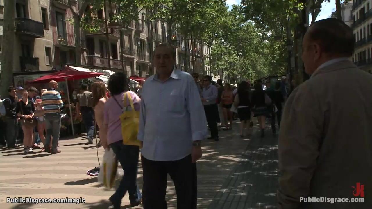 Bound naked European teen Dulce Mariposa with bucket in her teeth begs for change in public street then big dick master James Deen anal fucks her in threesome in the park