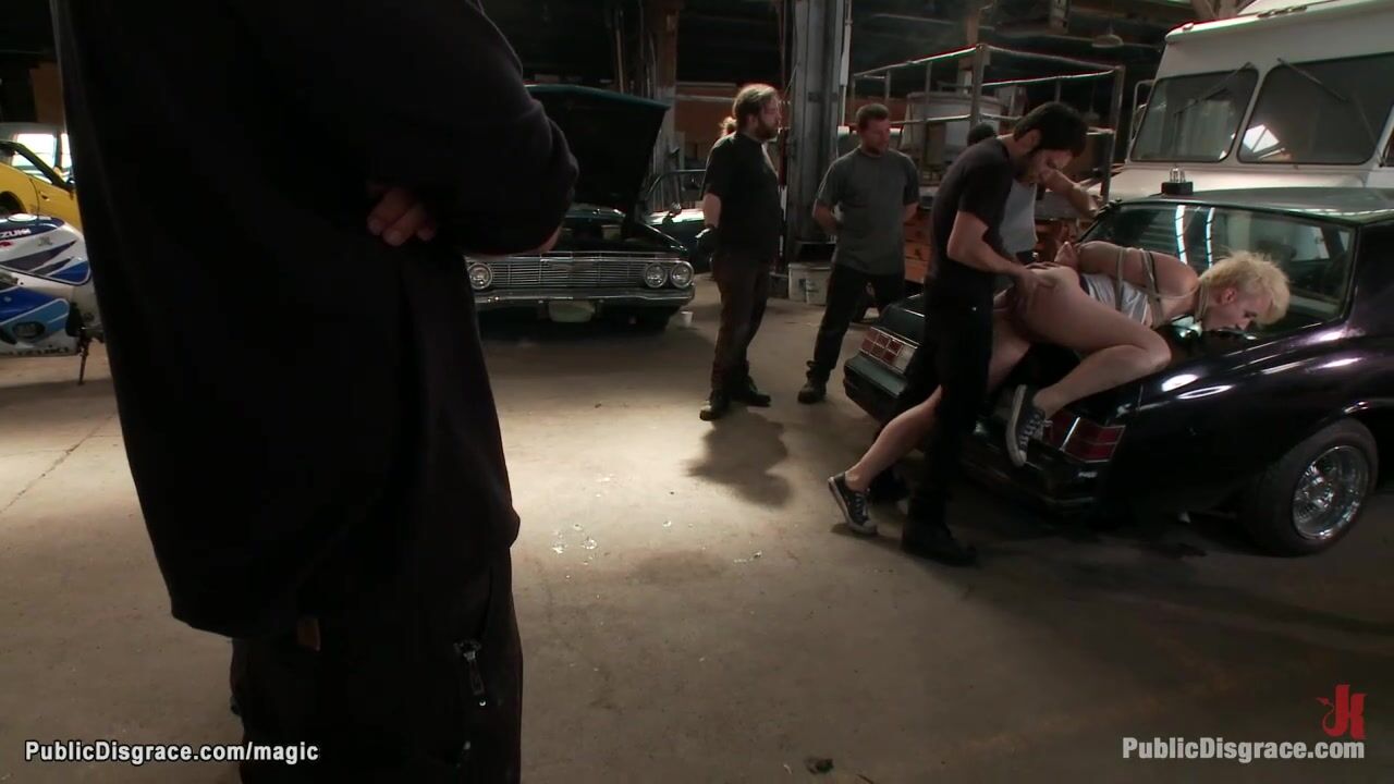 Tommy Pistol drags blonde hottie Dylan Ryan in auto repair shop then lets stranger anal fuck her with tool then he anal fucks her with big cock in front of public