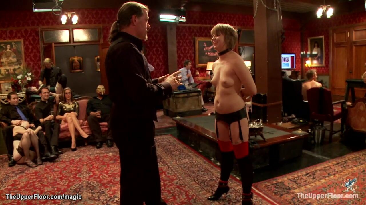 Two sexy House slaves Alani Pi and Casey Calvert are mouth fucked then anal banged till together sucking big dick for horny guests at orgy party in the Upper Floor