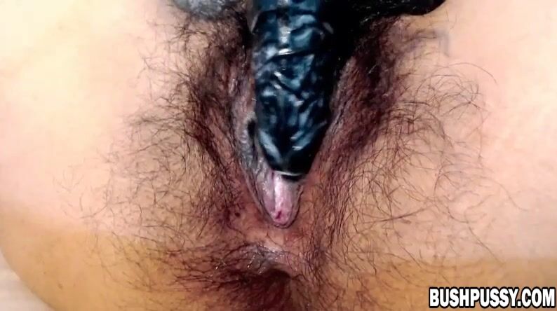 Babe fucks her creamy hairy bush pussy with dildo while closeup on webcam