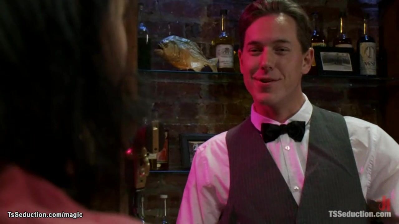Bartender Vern Hopkins worships and suck big cock to his tall brunette shemale guest Yasmine Lee then takes it in his tight ass in his bar after closing time
