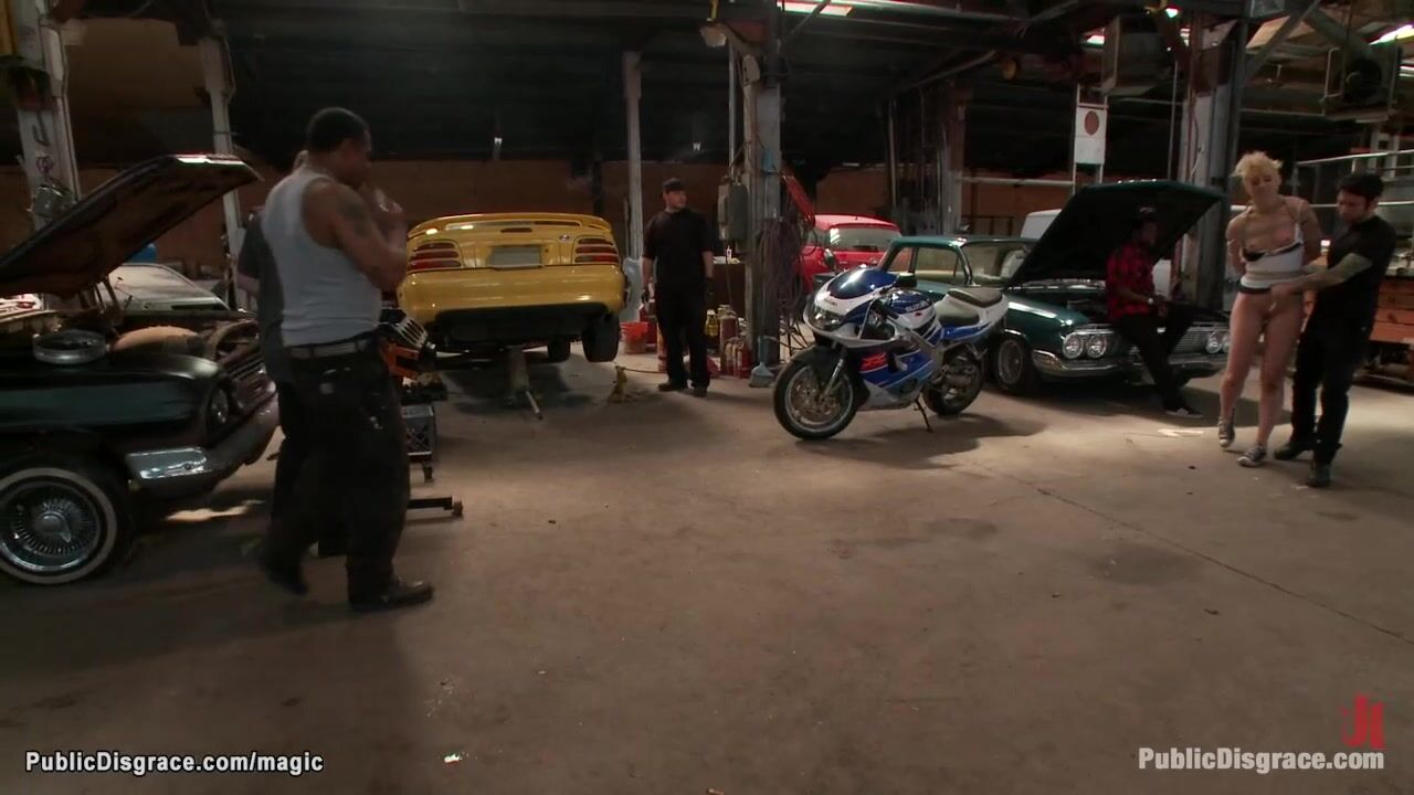 Tommy Pistol drags bound blonde hottie Dylan Ryan in public auto repair shop then anal fucks her with tool and big cock for strangers