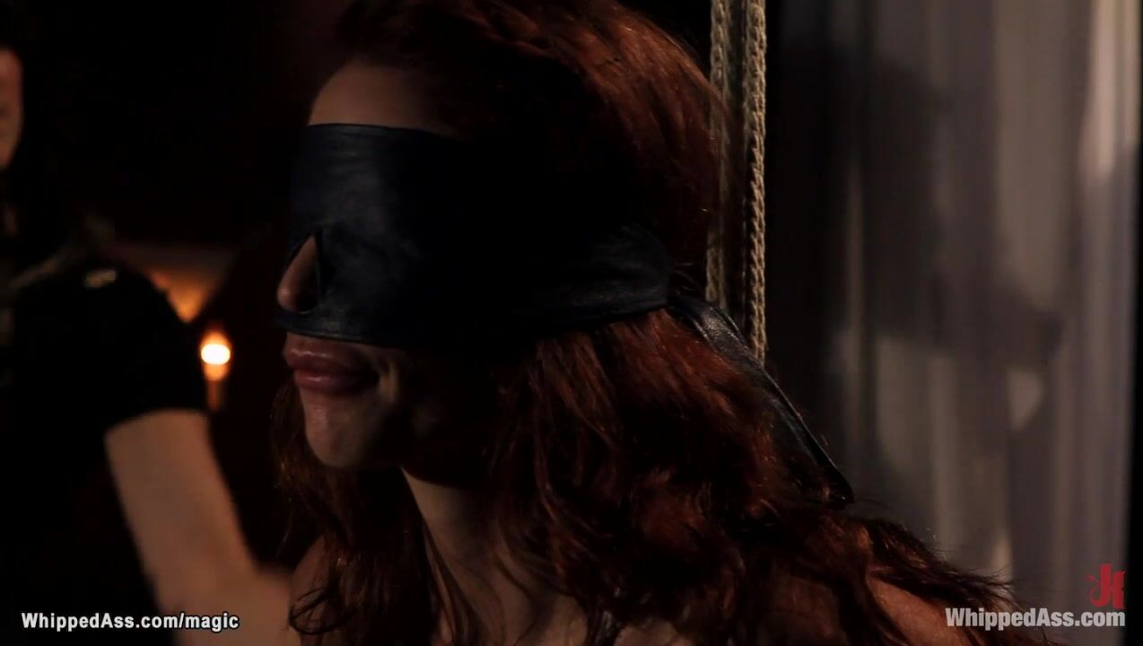 Bound on knees and blindfolded big tits redhead lesbian slave Monique Alexander gets hard flogged then in bed pussy vibed and fisted by mistress Bobbi Starr