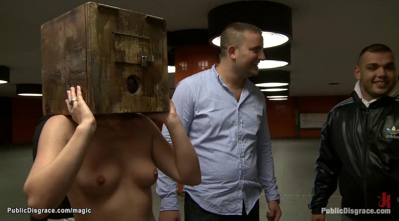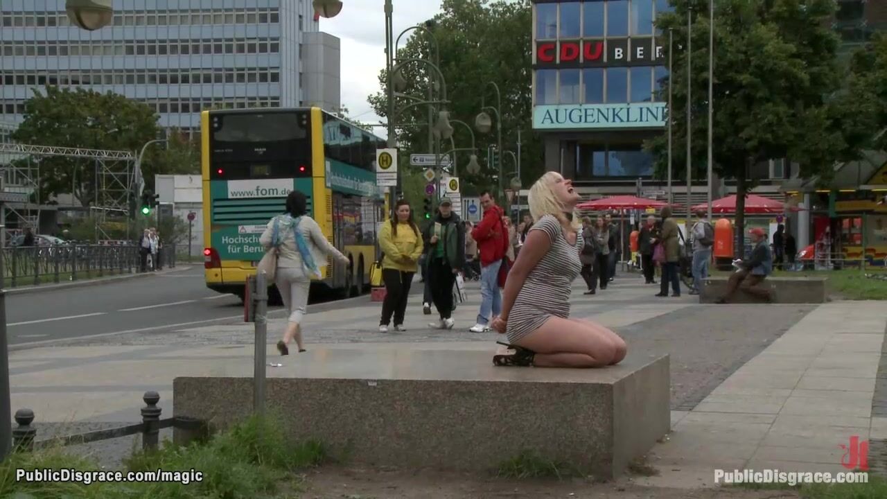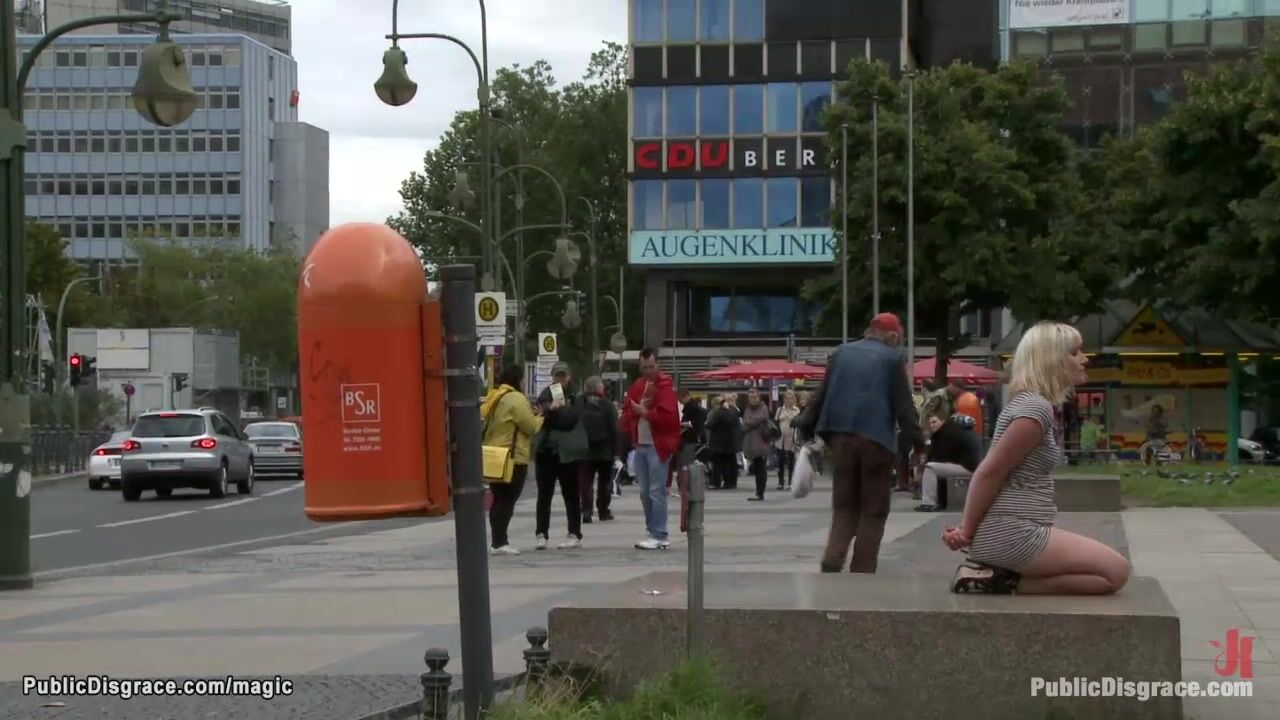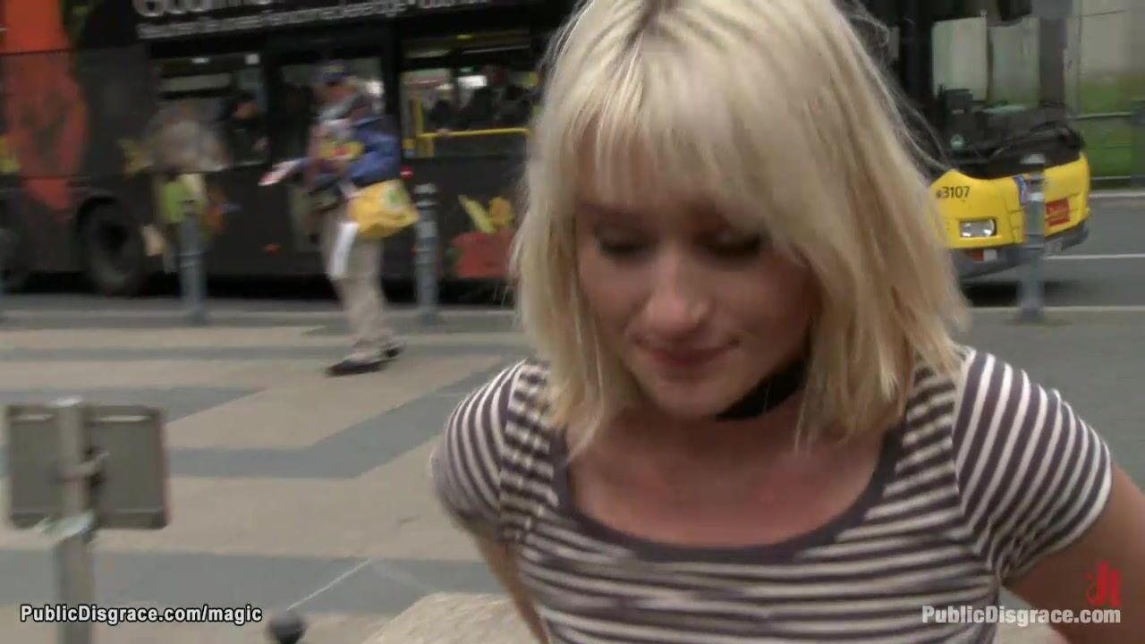 German blonde babe Uma Masome electro shocked with remote controled device in public then group anal fucked by huge cocks in the middle of the night outdoor