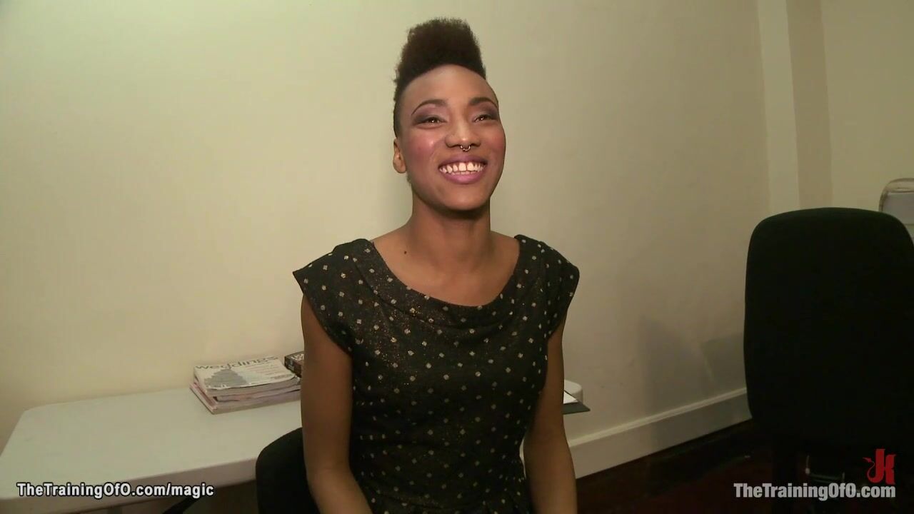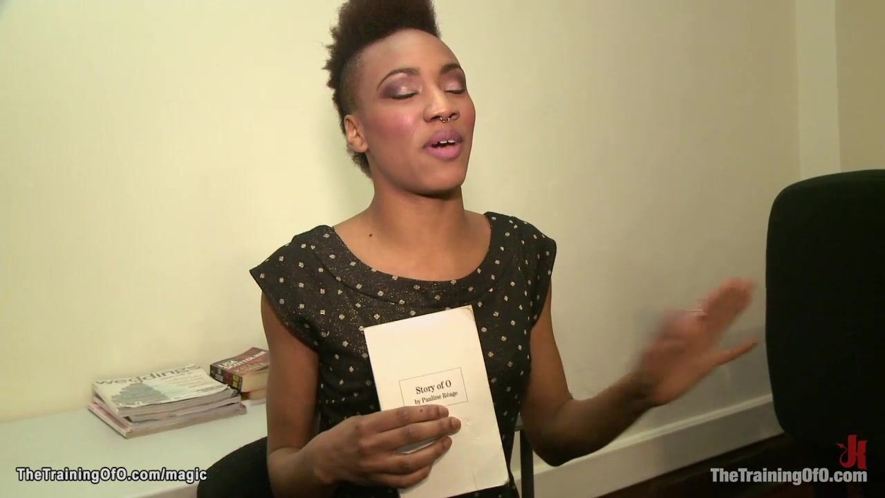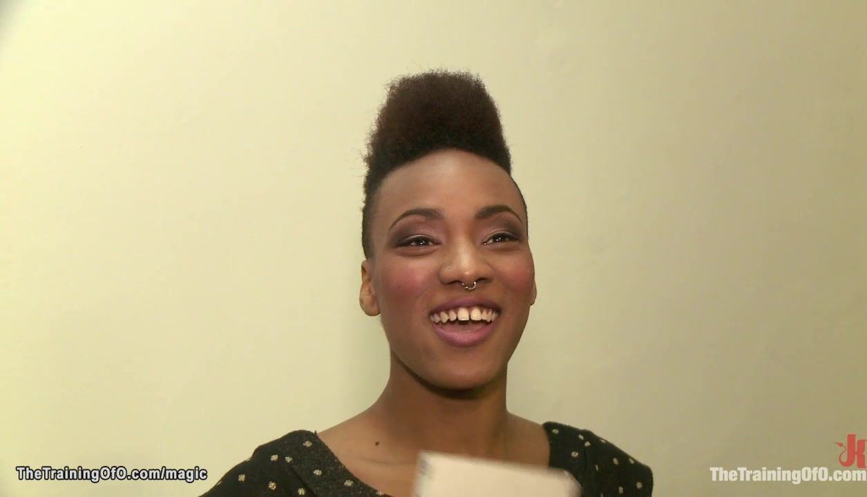Master James Mogul gags and binds ebony slave trainee Nikki Darling and whips her pussy then makes her squating on black dildo and endure pain