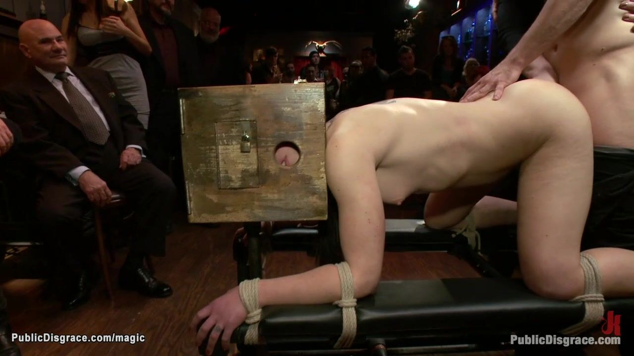Bound brunette babe Cheyenne Jewel gets whipped then in doggy style position with head trapped in box anal fucked by big cock in crowded public bar