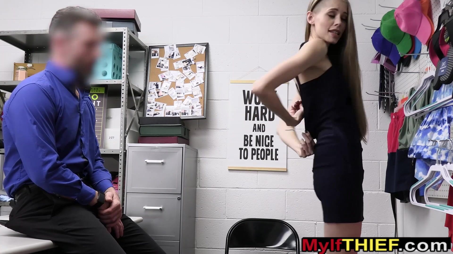 Skinny blonde MILF thief with small tits got caught and strip searched by a LP officer but she exactly knew hot to get out of trouble She took his big cock and after a blowjob she let him to fuck her trimmed pussy