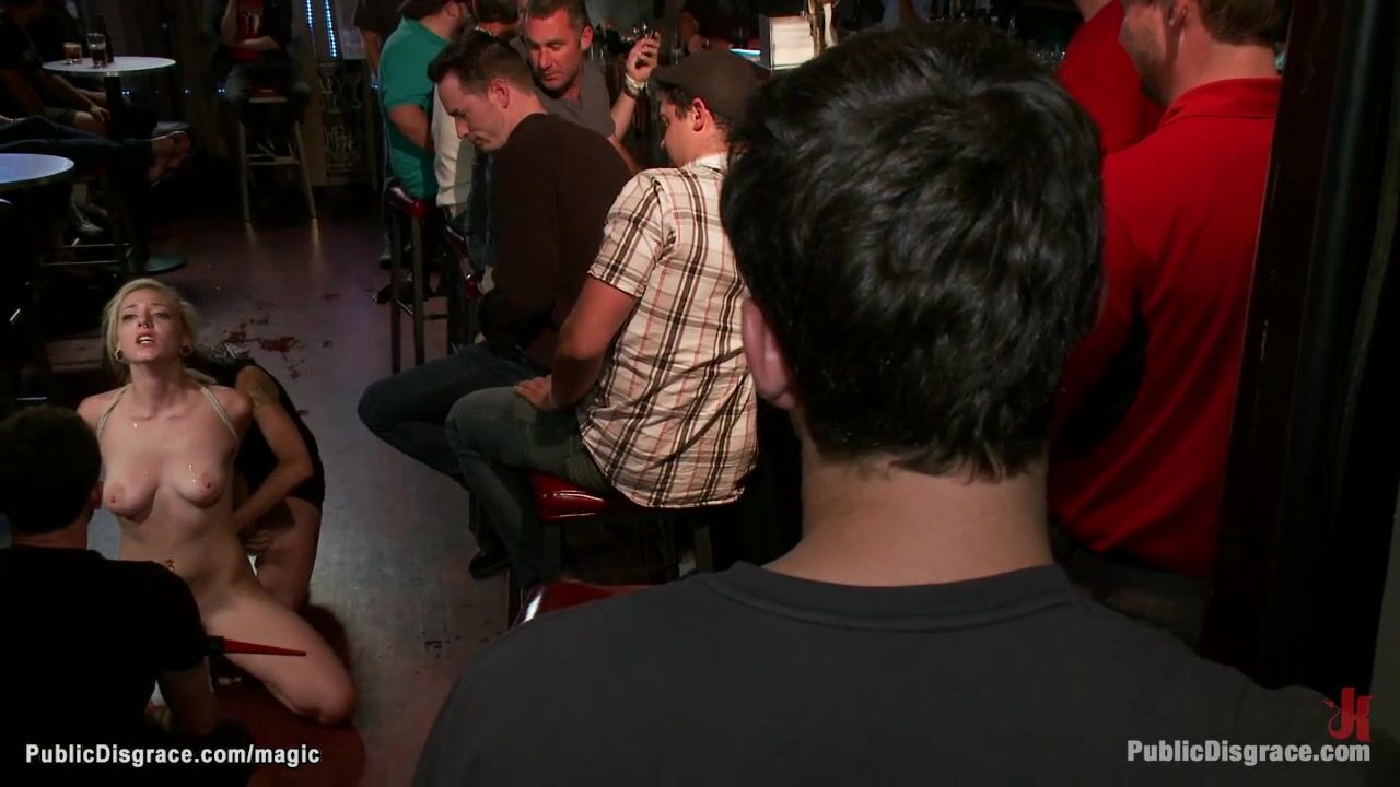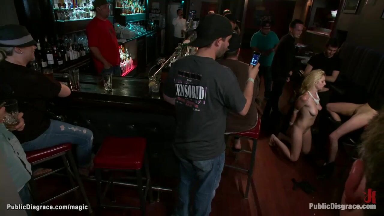 Bound by Princess Donna Dolore blonde babe Rylie Richman gets pussy vibed then throat and shaved pussy rough fucked by big cock James Deen in public crowded bar
