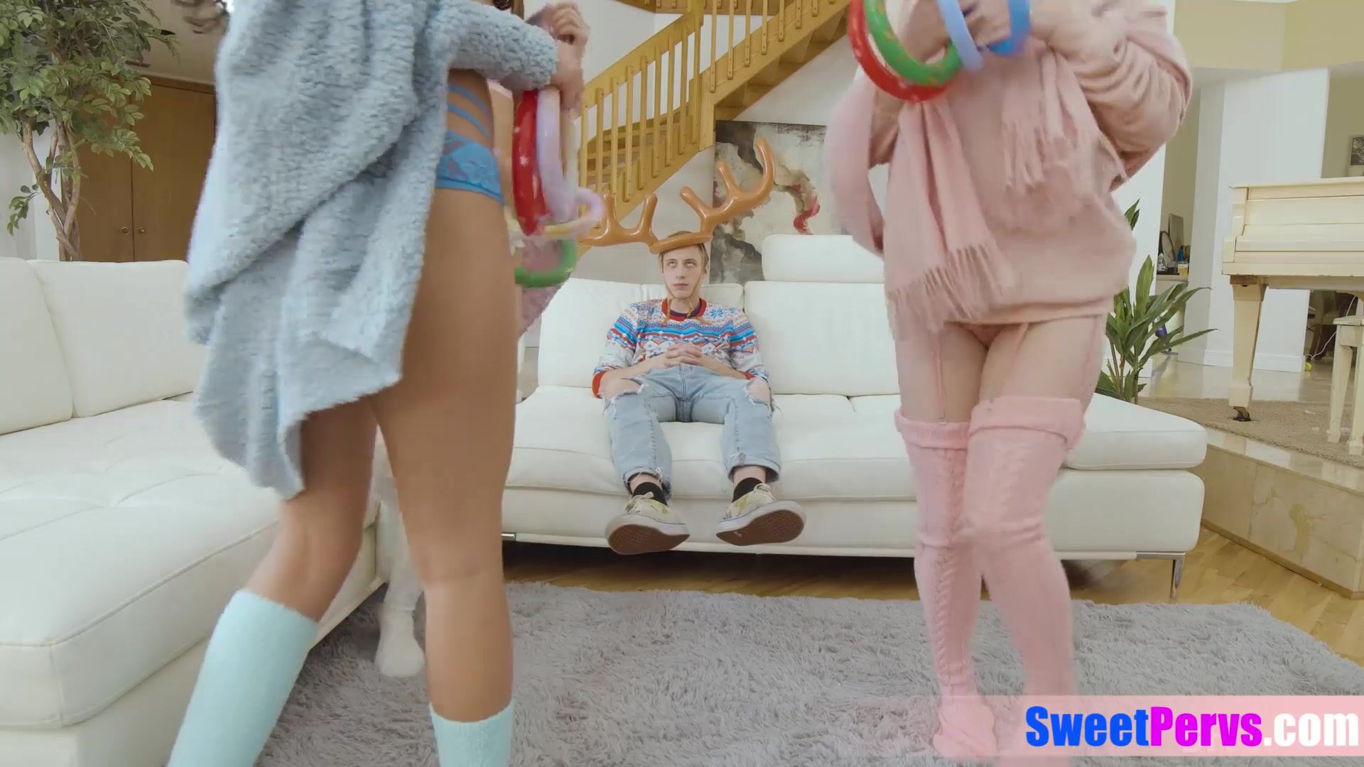 Three teens Carrie Sage Koco Chanel and Alice Visby are completely naked after a nasty game and ready to show their roommate what they can do to his big cock They giving him a sloppy blowjob then fucking it during thely licking each other