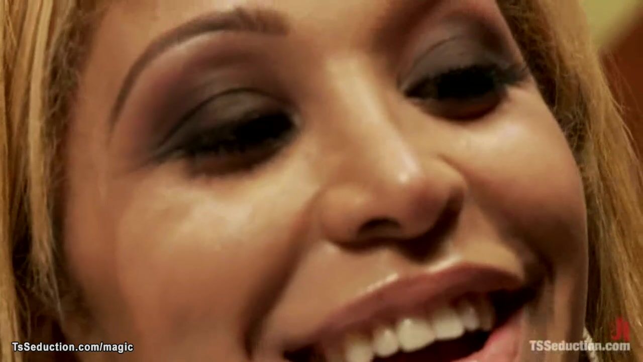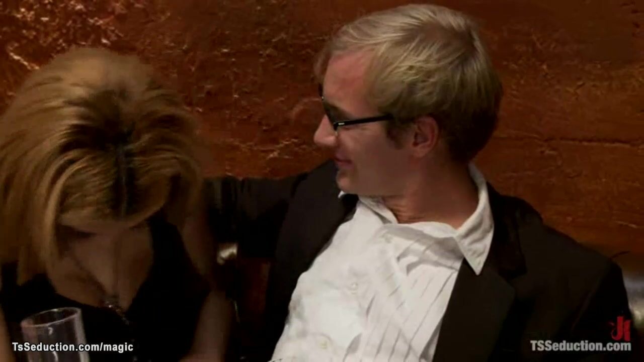 Big tits blonde Latina shemale Jessica Host gets blowjob on huge dick from blond man Ned Mayhem then anal fucks him on leather couch and wanks him off