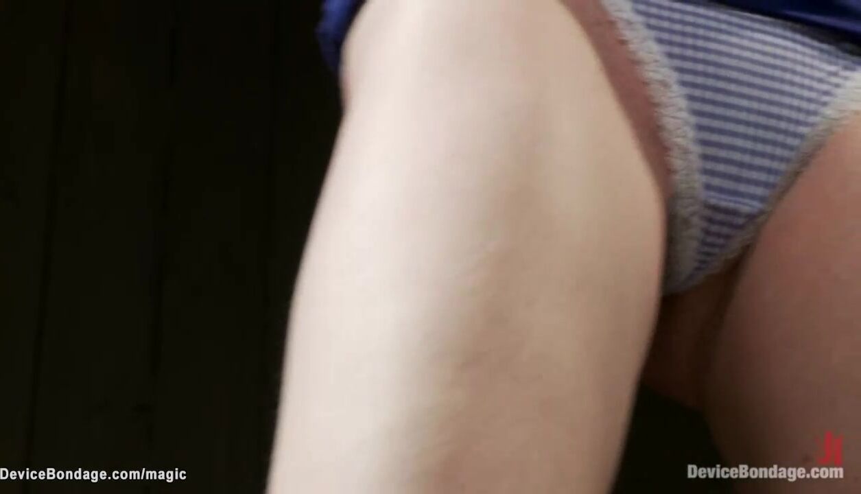 Big tits brunette slave Scarlet Faux is bound in standing position and hard whipped then shaved pussy fucked with dildo on a stick and clamped in back arch position by master Orlando
