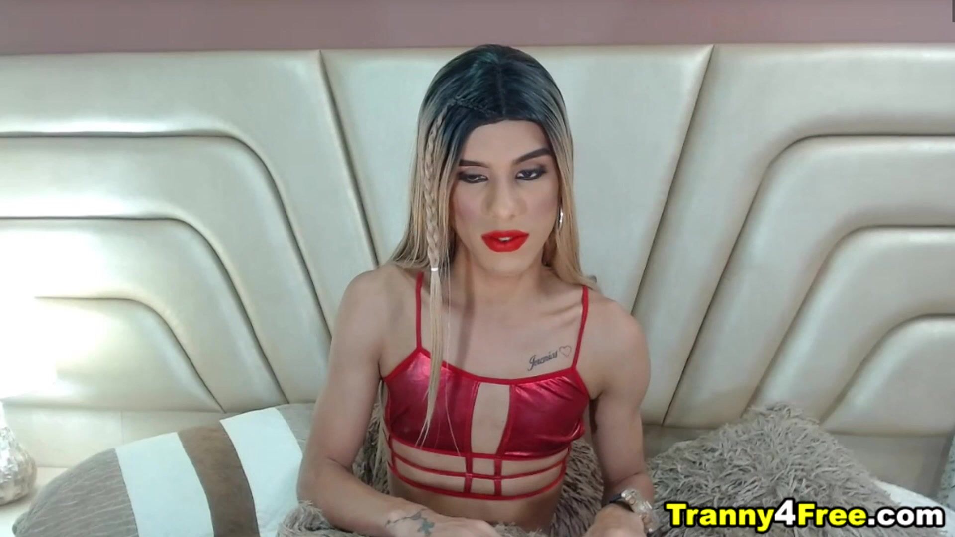 Seductive Ladyboy Strokes Her Long Erect Cock