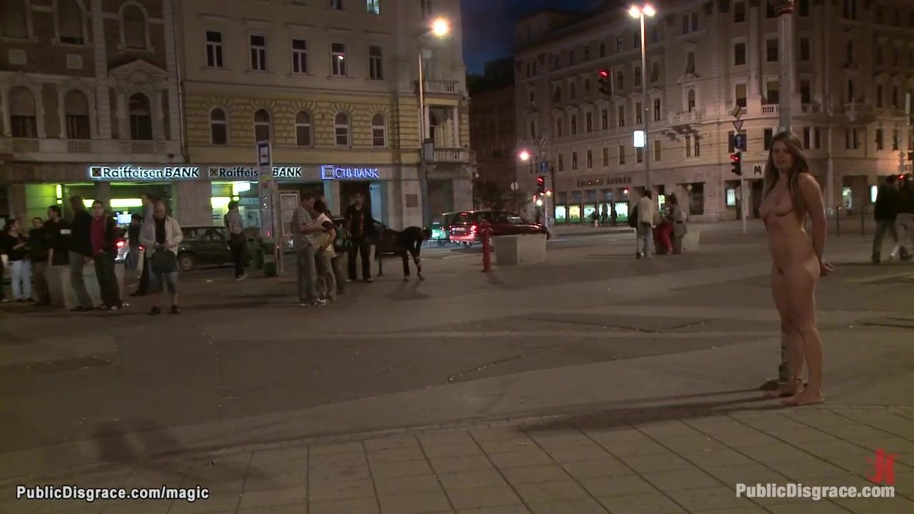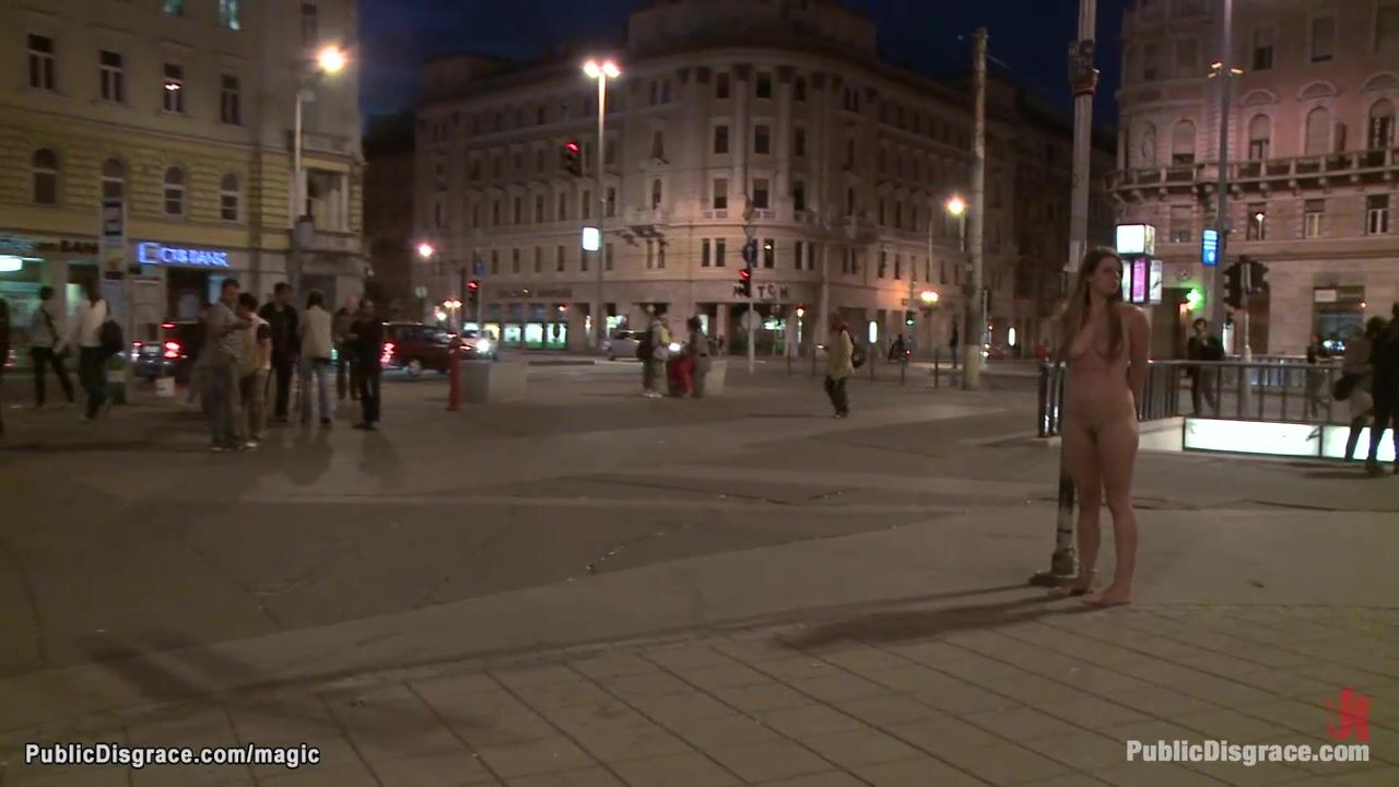 Dirty face big tits Czech naked slave Mona Lee gets bound in metal stock and walked in public then fucked by big dick James Deen and Princess Donna Dolore all over town