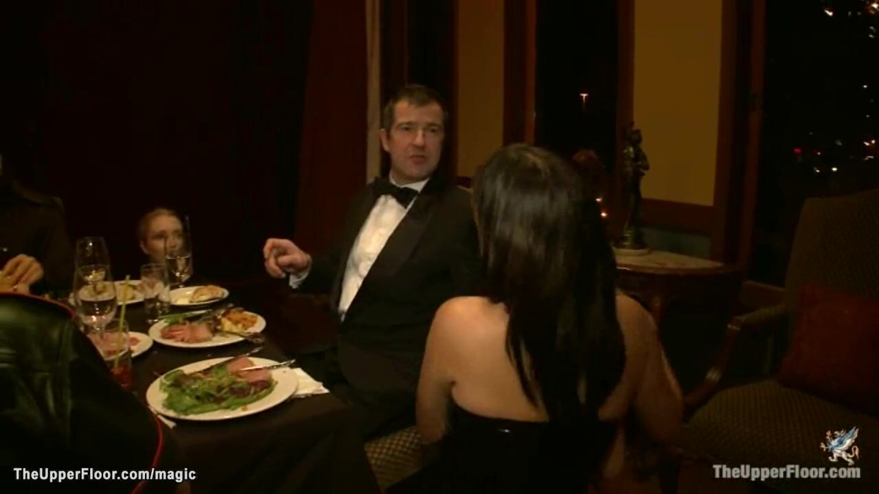 At Xmas dinner party hot slaves Coffee Brown and Iona Grace and Sparky Sin Claire are bound and spanked and caned and tormented by masters and horny guests in the Upper Floor