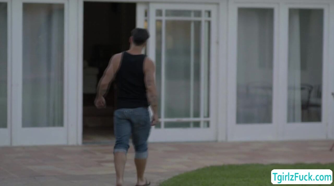 Big tits brunette shemale talks over the phone by the pool when she sees masculine stud tempting body cleaning. The two went to the couch where they deepthroat blowjob each others bigcock and he anal bareback her ass hardcore doggystyle and missionary.