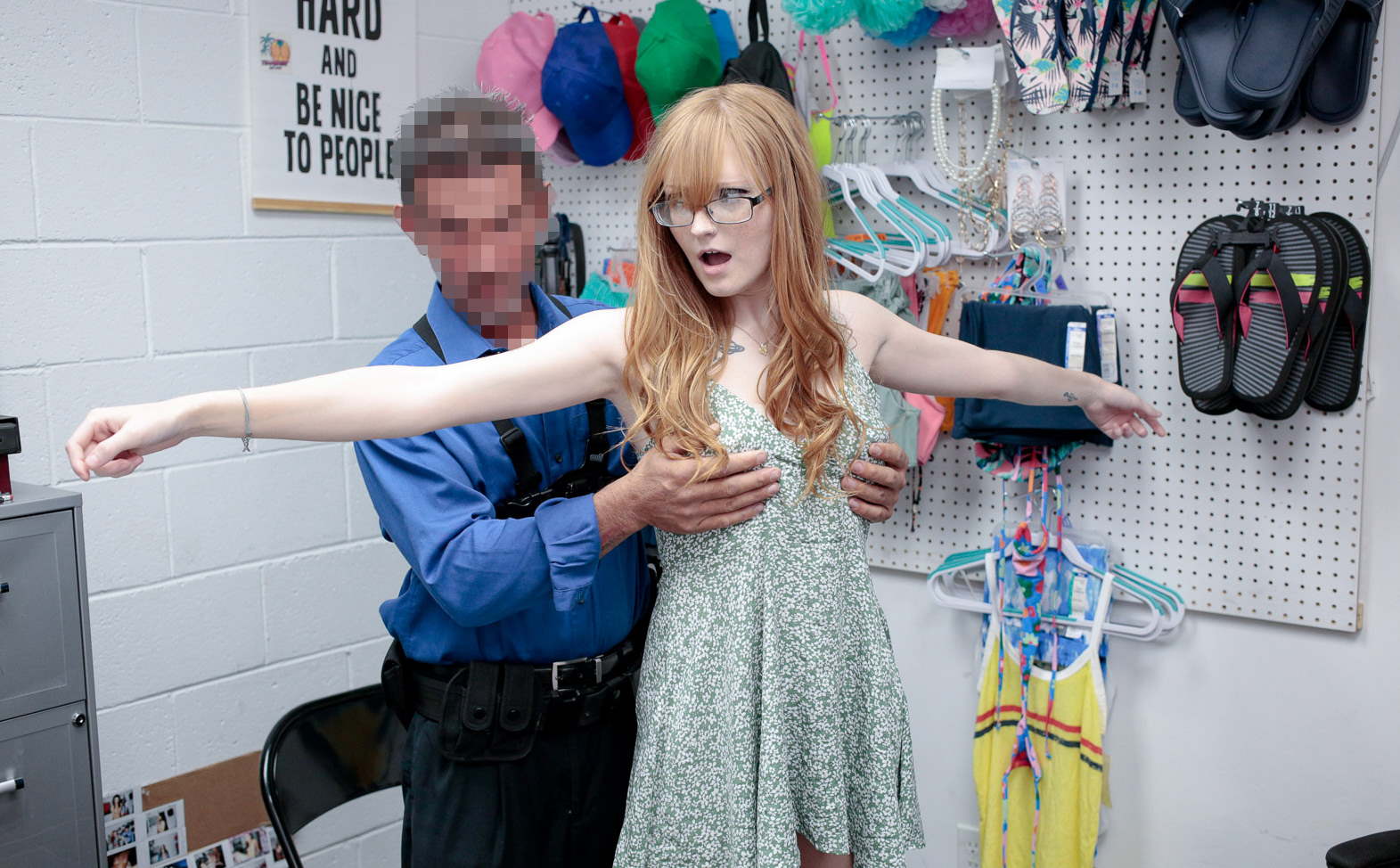 She looks way too fine so the mall cop is ready to make a deal with her. He wont call the real cops unless she gets on his cock at the office!